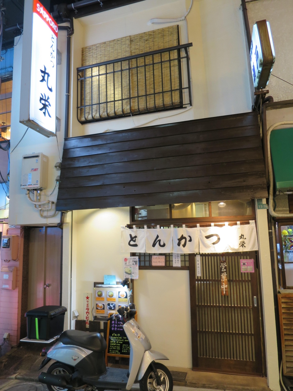 自由が丘のロータリーにある住友銀行の脇道を入って行き、マクドナルドの左斜め前にある古くからある小さなとんかつ店です。1階はカウンター6席、2階にも客席があります。