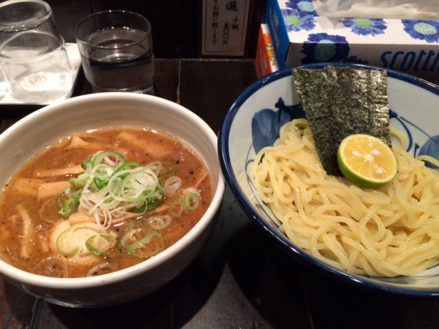麹町の紀尾井町交差点の角にめん徳 二代目 つじ田 麹町店があります。金曜の夜、店前を通ると6人程店外でならんでおり、気になって並んで食べました。店内はカウンター席で8席しかありません。つけ麺980円をいただきました。よくある魚介系のスープとは一味違った味でカボスが良く合いました。