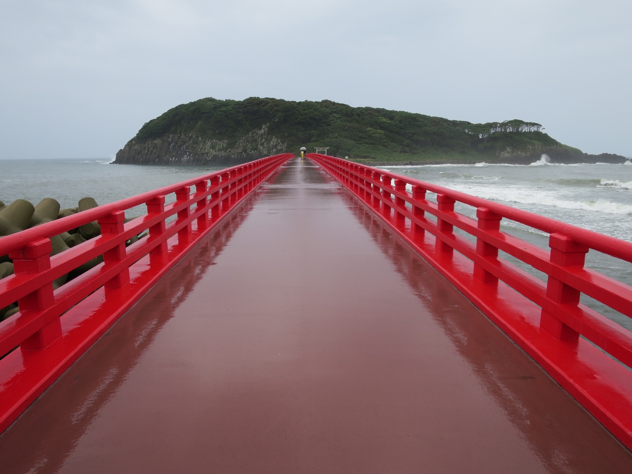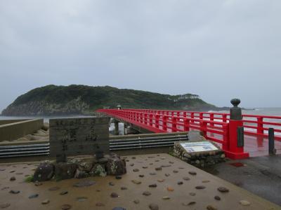 東尋坊の2k程先の越前海岸の先に赤い橋が架けられた雄島が見えます。台風が近海に迫る前に行きました。橋のたもとには無料の駐車場があり、そこから橋を歩いて渡るのですが、台風の影響で波が高く、少し怖いほど危険でした。雄島には歴史ある大湊神社があり、うっそうとした木々が神秘的な島です。