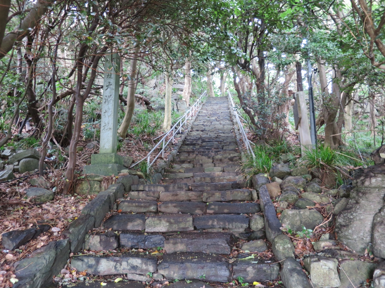 東尋坊のある越前海岸の先に浮かぶ雄島にある神社本殿があり、半島側に里宮が海を隔ててあります。里宮は行きませんでしたが、本殿に行って来ました。赤い橋を渡り雄島に渡ると鳥居があり、その先の森にある石段を上って行くと本殿があります。源義経、朝倉義景、明智光秀も訪れた歴史ある神社です。