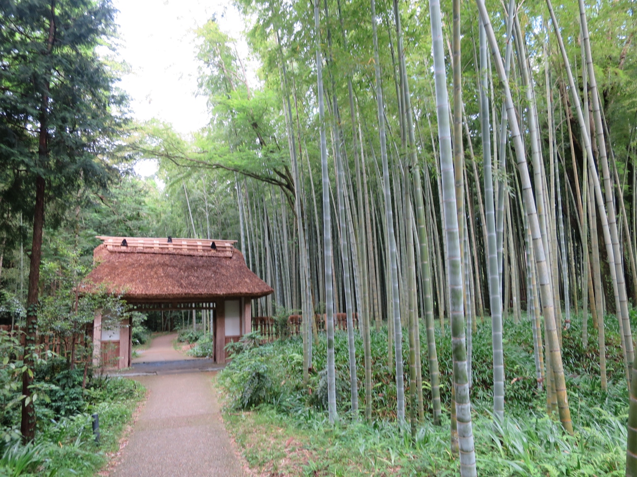 駐車場から竹林の横の茅葺山門をくぐって中に入ると、森の自然豊かなあずま屋などがある散策路が続きます。とらや工房は自然と調和する木造平屋の建物で素晴らしい雰囲気です。