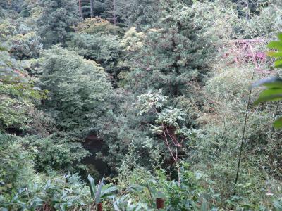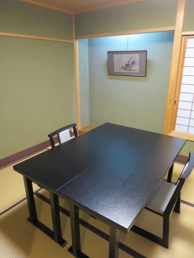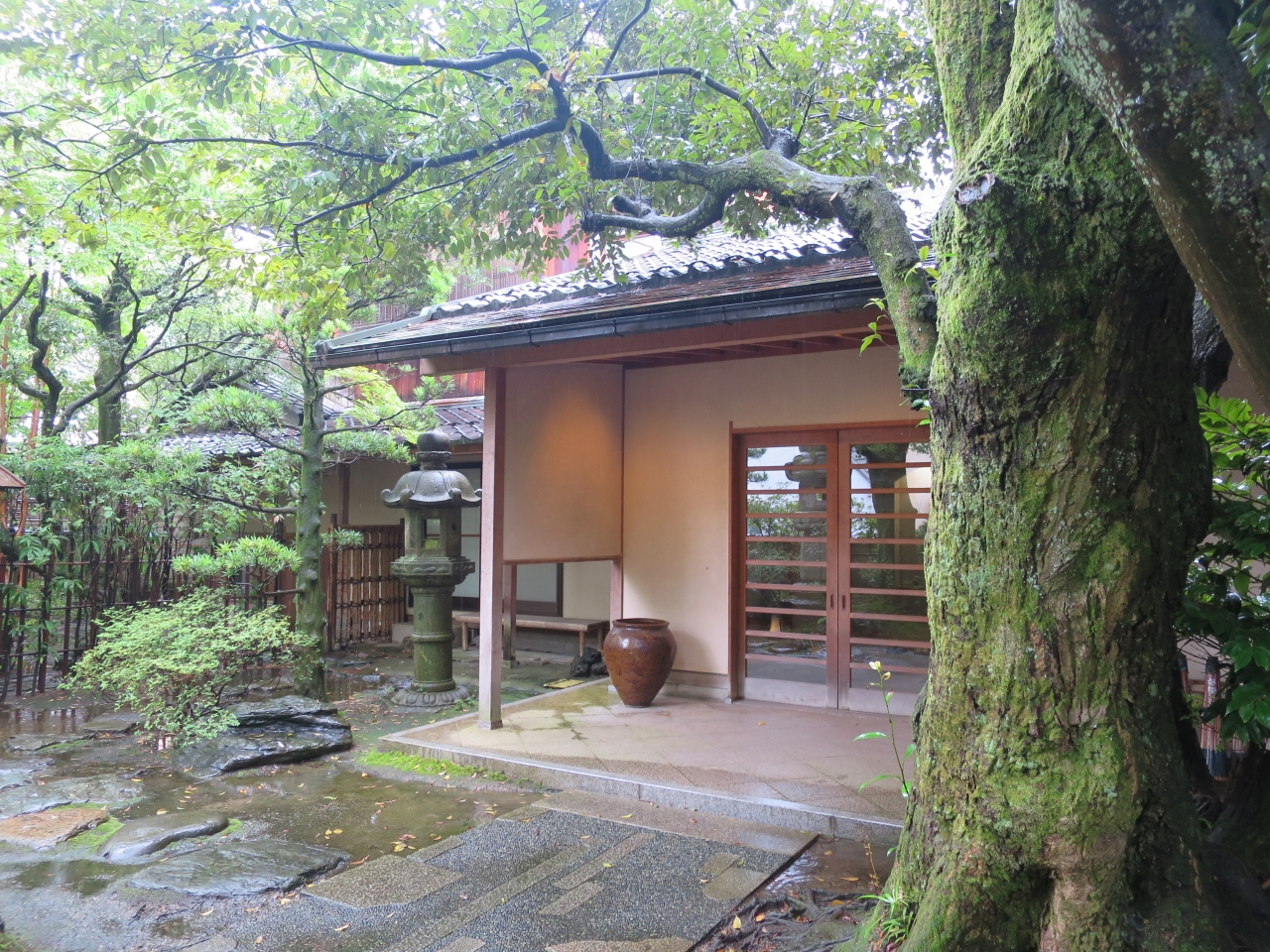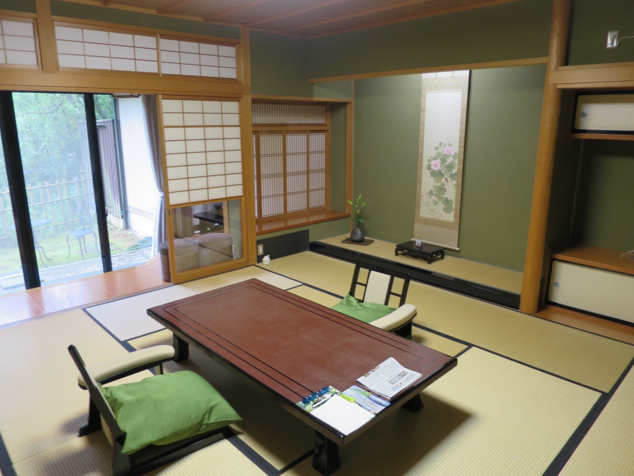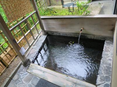 宿泊した部屋は少し豪華に露天風呂が付いた1F客室「黒谷」で、12畳の和室に6畳の部屋、鶴仙渓に面した露天風呂の付いたお部屋に泊まりました。小さな前庭にはテーブル、椅子が置かれているのですが、台風の影響による大雨で庭には出られませんでした。