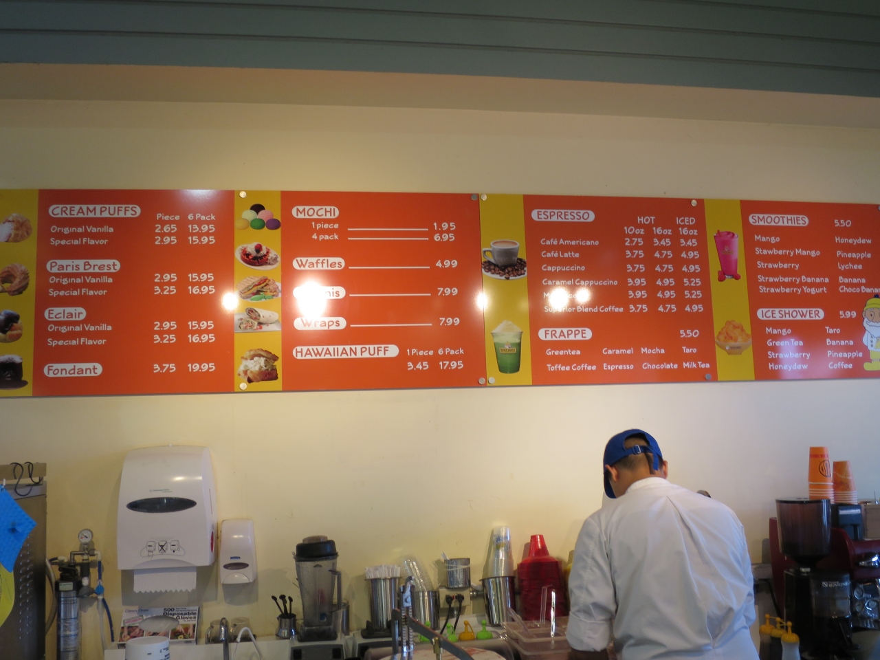 びっくりしたのはシュークリームの値段の高いこと。日本では170円程の物が倍程の価格です。それにシュークリームがメインではなく、もちアイスや、シャーペット等のスイーツのー方のメニューの方が多いです。