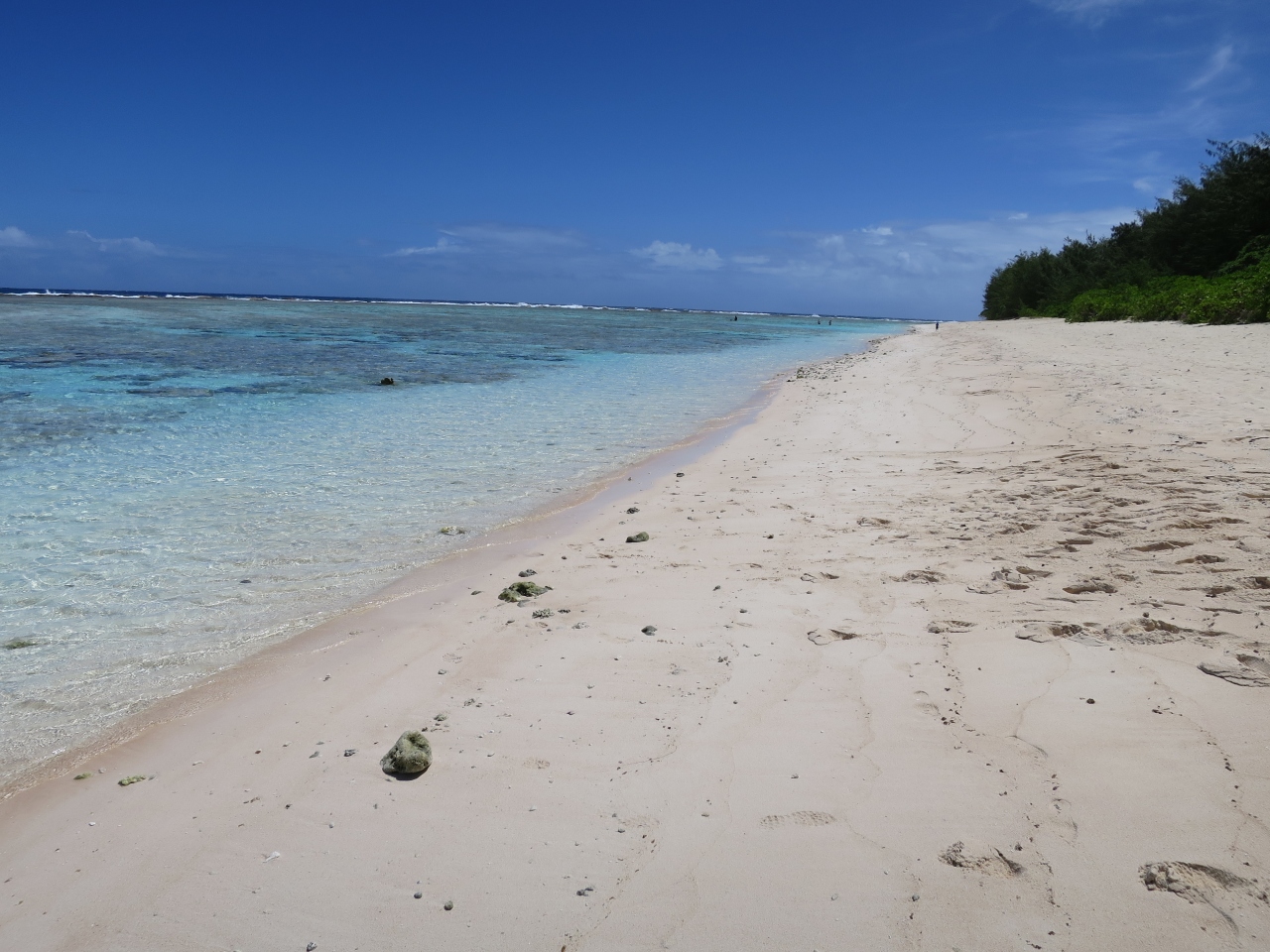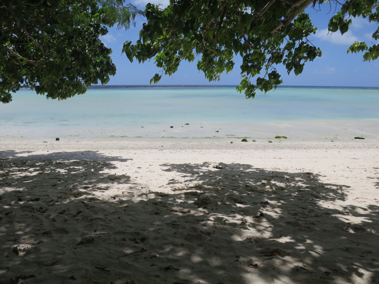 駐車場に車を停め、歩いて木陰を抜けると白いビーチに青い海と、遠海ではじける波がとても印象的です。タモン湾のビーチの様に人は多くなくのんびりと過ごすことできます。