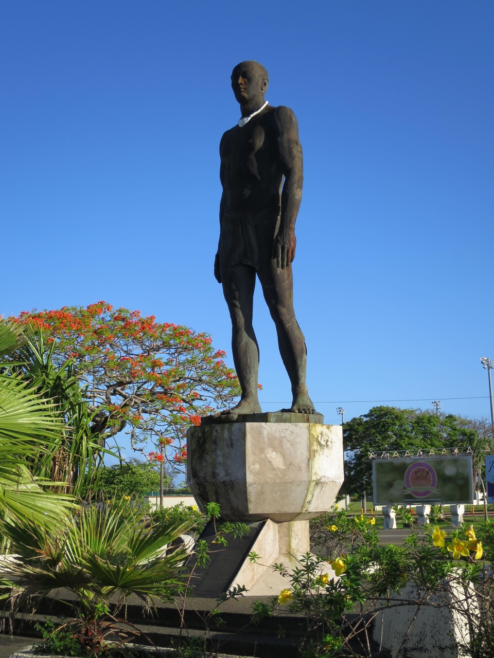グアムをレンタカーを借りてドライブしたとき、Marine Corps Driveをタモンから走って行くと、右手に大酋長キプハ像が見えてくると、見えます。
