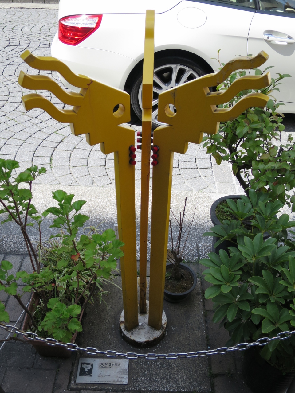 麻布付近にある12の大使館の協力で作られた12の微笑みのモニュメントの一つで、ベネズエラのホルヘ・ブランコが制作した「太陽の微笑み」のモニュメントです。パティオ十番に近いラーメン 和たまの前に設置されています。モニュメントの前には鎖が張られ、植木の鉢に囲まれて、馴染んでいる所が少し滑稽です。こちらも立ち止まって見る人は殆どいません。