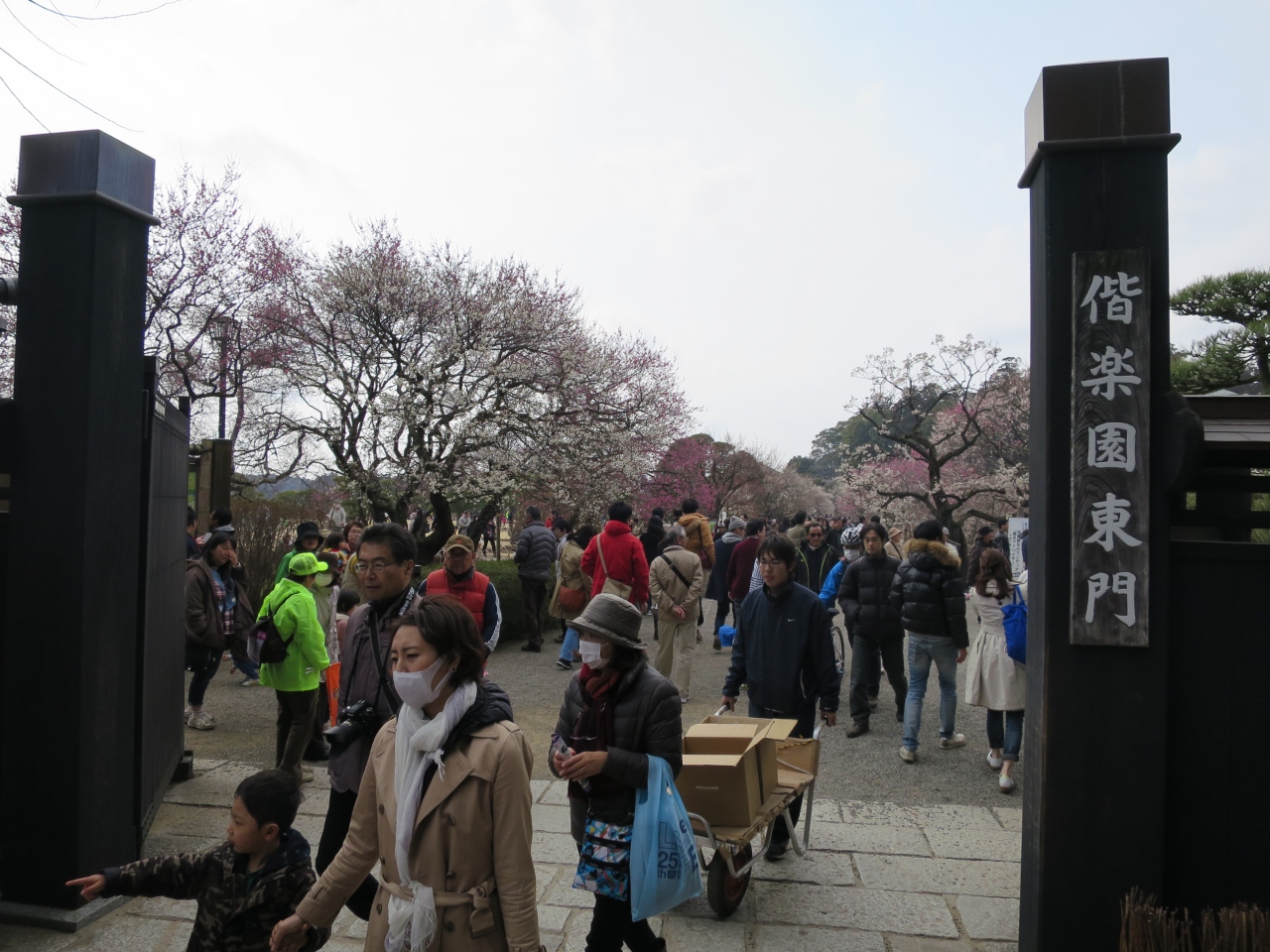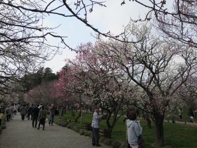 偕楽園で開催された水戸の梅まつりに行って来ました。自動車で水戸ICに着くと、3kmのIC渋滞。それほど沢山の人が訪れます。偕楽園には沢山の駐車場がありますが、またここで渋滞。車で行くなら、遠回りですが、バイパス経由で南側からアクセスする方が空いており、うまいこと千波湖脇の駐車場にいれられました。線路を越え偕楽園に入ると沢山の種類の梅が咲いていました。咲く時期が異なるので、すべての梅が咲いている訳ではありません。