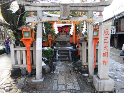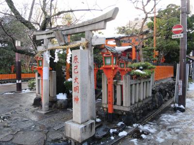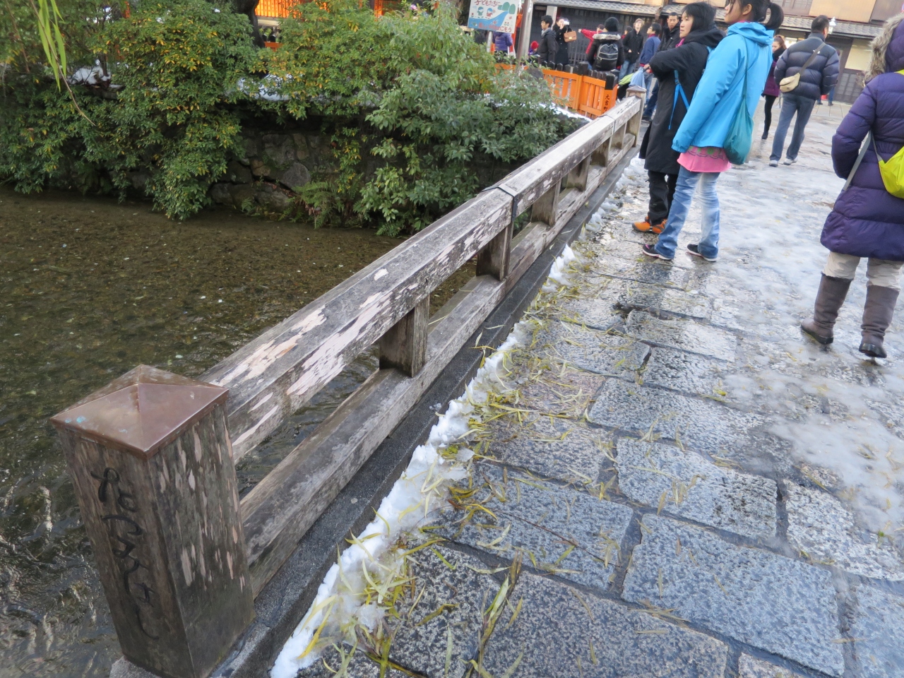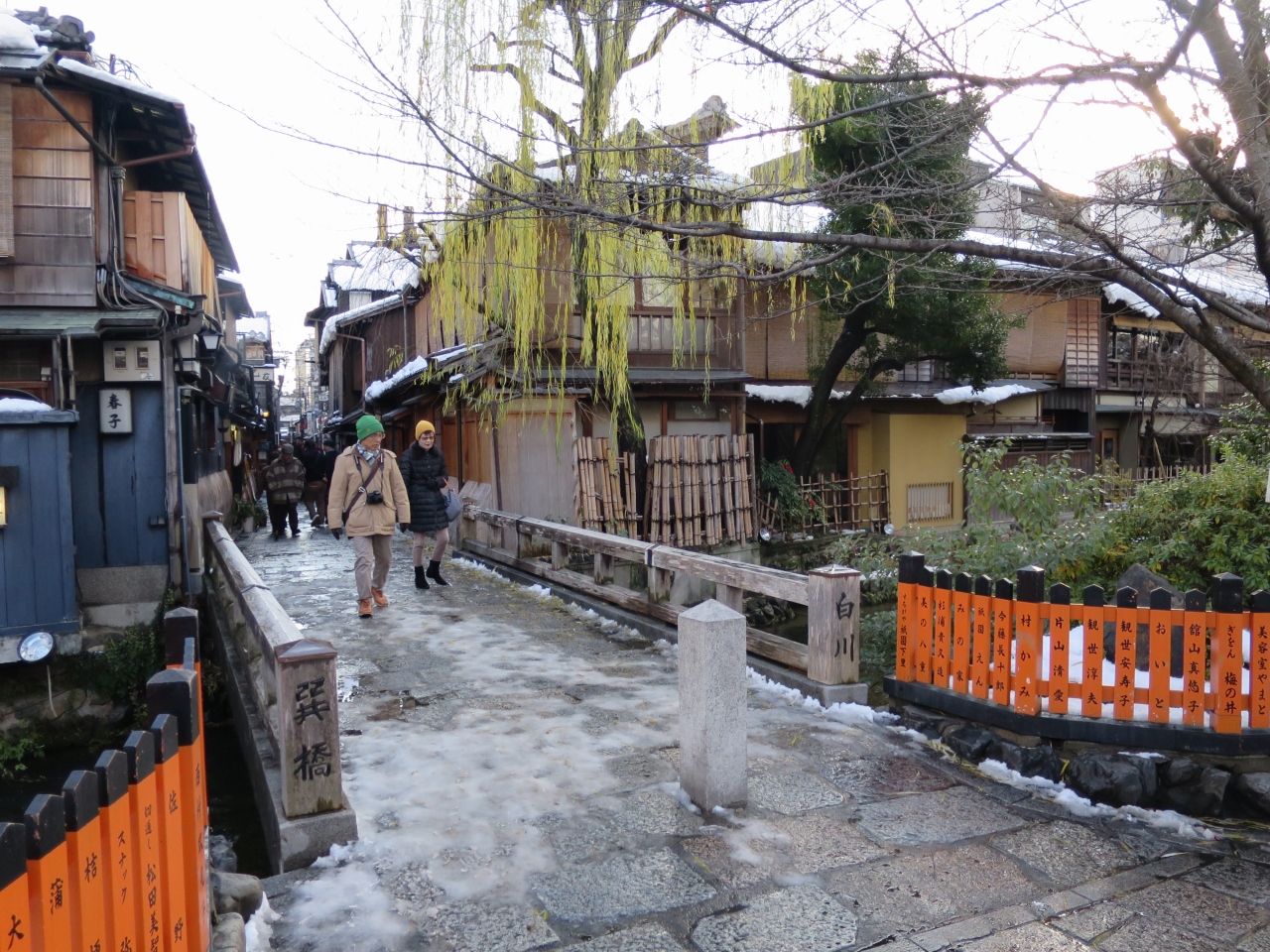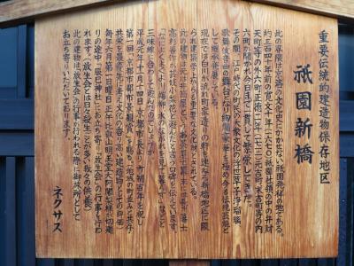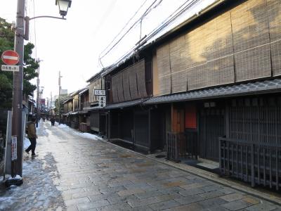 祇園 白川通り沿いには、同じ高さの2階建て町家造りの町並みが続き、昔の京都にタイムスリップしたような場所です。近くには白川が流れ、石畳の通りの正面には辰巳大明神がありとても風情があり観光客も沢山訪れる場所です。この町屋にはお店が入っていいるよですが、高級なお店が多いようです。