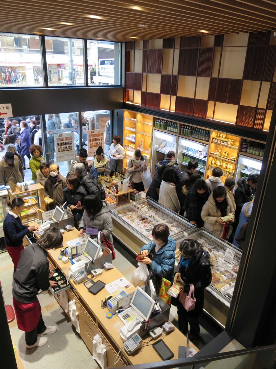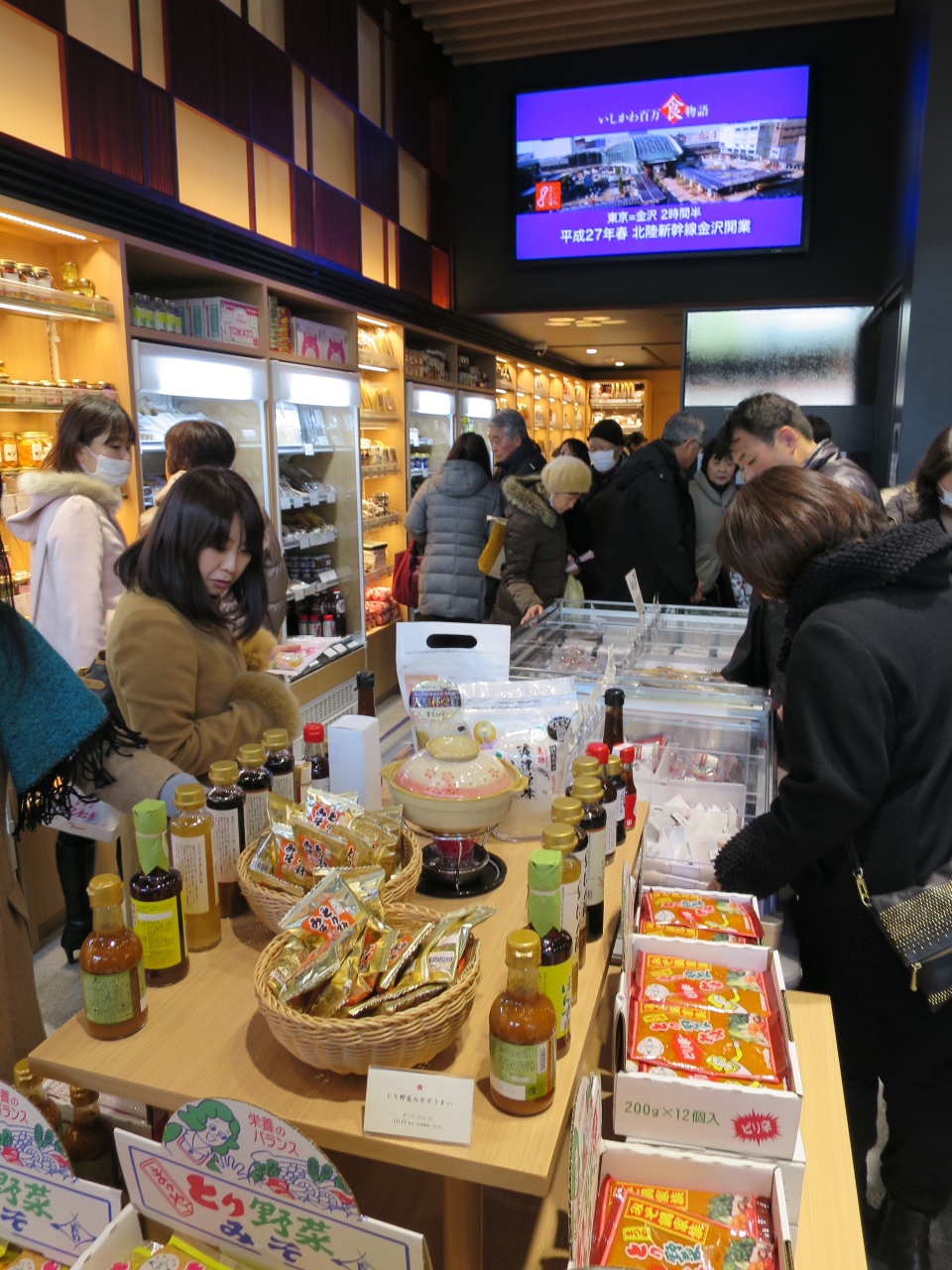 北陸新幹線が3月に開通することもあり、沢山の人が訪れていました。B1Fから2Fの3フロアあり、B1Fでは俵屋のみずあめ等の和菓子、酒、1Fは特産品、2Fは工芸品が売られ、カフェが併設されています。この店では金沢の庶民の鍋、とり野菜みそが買えます。シンプルな鍋で野菜と鳥だけの鍋ですが、とても美味しいですよ。