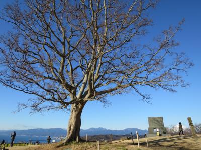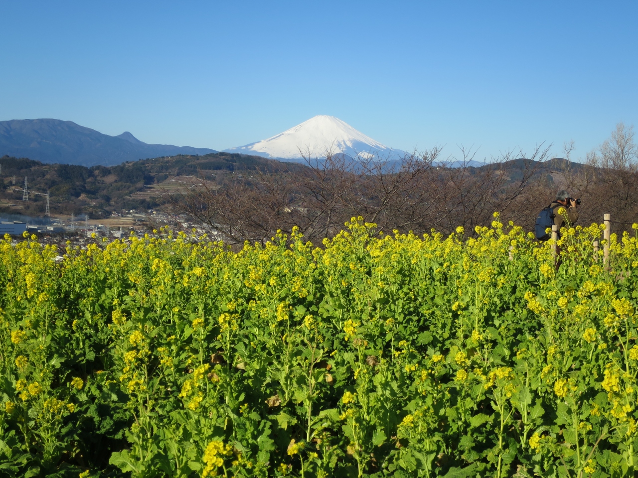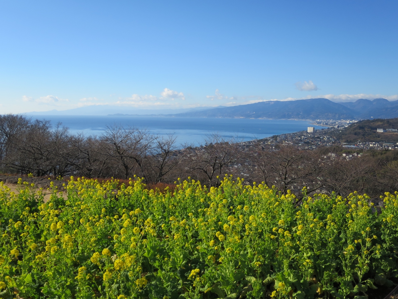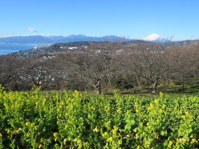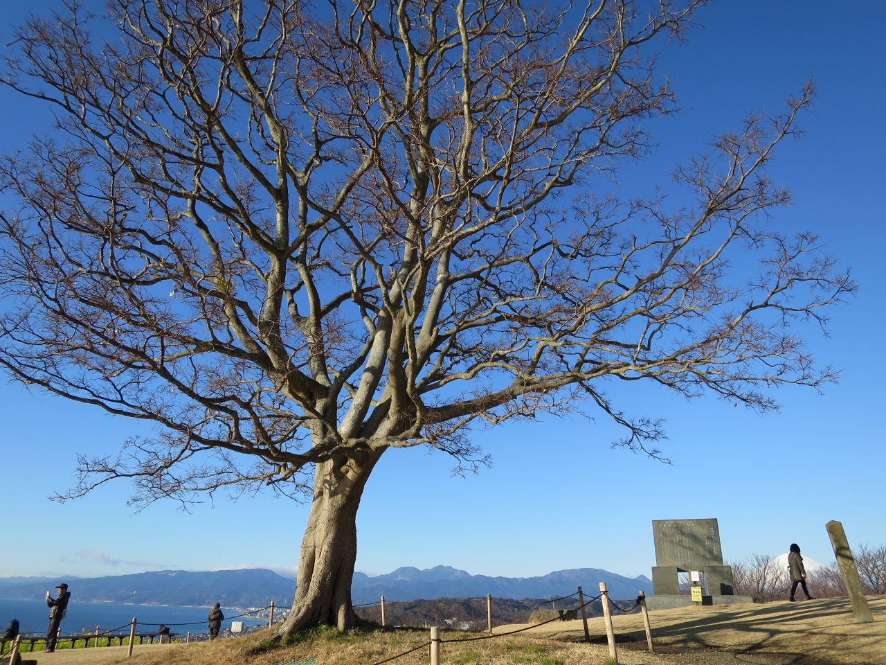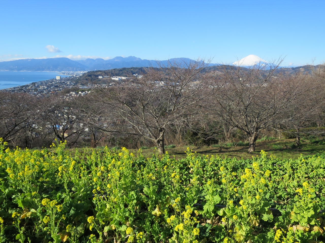 頂上につくと芝生が広がり一本の枝ぶりが見事な木があり、その先に進むと菜の花があり、奥に富士山と相模湾の絶景が望めます。上るのは大変ですが、ともかく素晴らしい景色です。富士山を見るならば雲が出にくいの午前中がお奨めです。午後になると雲が湧きやすくなります。- 旅行時期