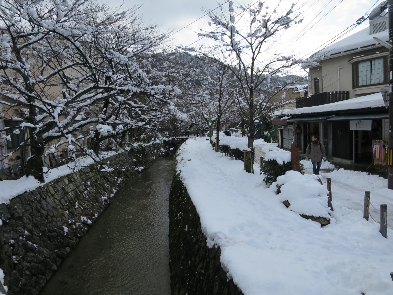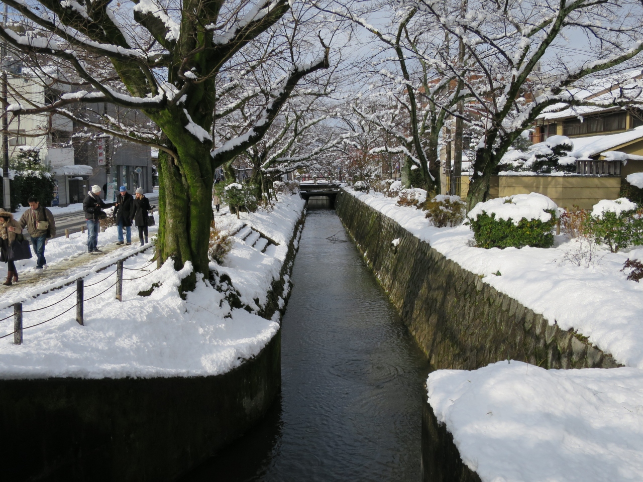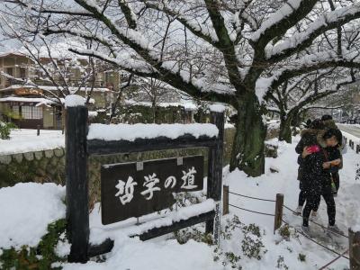 京都 東山の銀閣寺道から若王子神社付近まで続く疏水に沿った散策小徑です。これまでも桜、新緑、紅葉の時期など何度も訪れたことがありますが、雪景色の哲学の道を訪れたのは今回が初めてです。雪の積もった桜の木々がアクセントとなり、一味違った哲学の道となっていました。ただ、足元が悪く滑るので散歩するには注意が必要です。