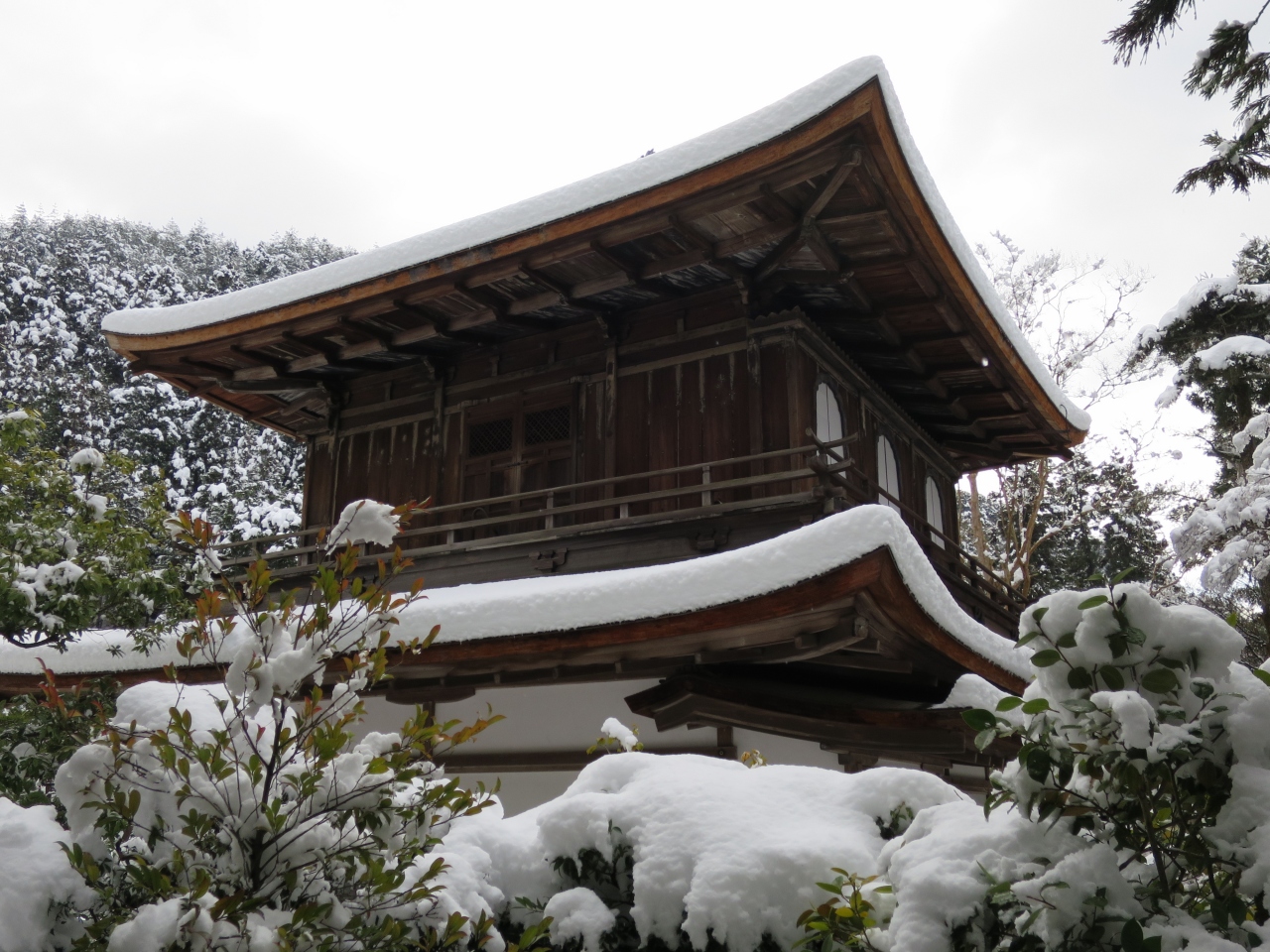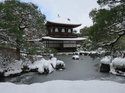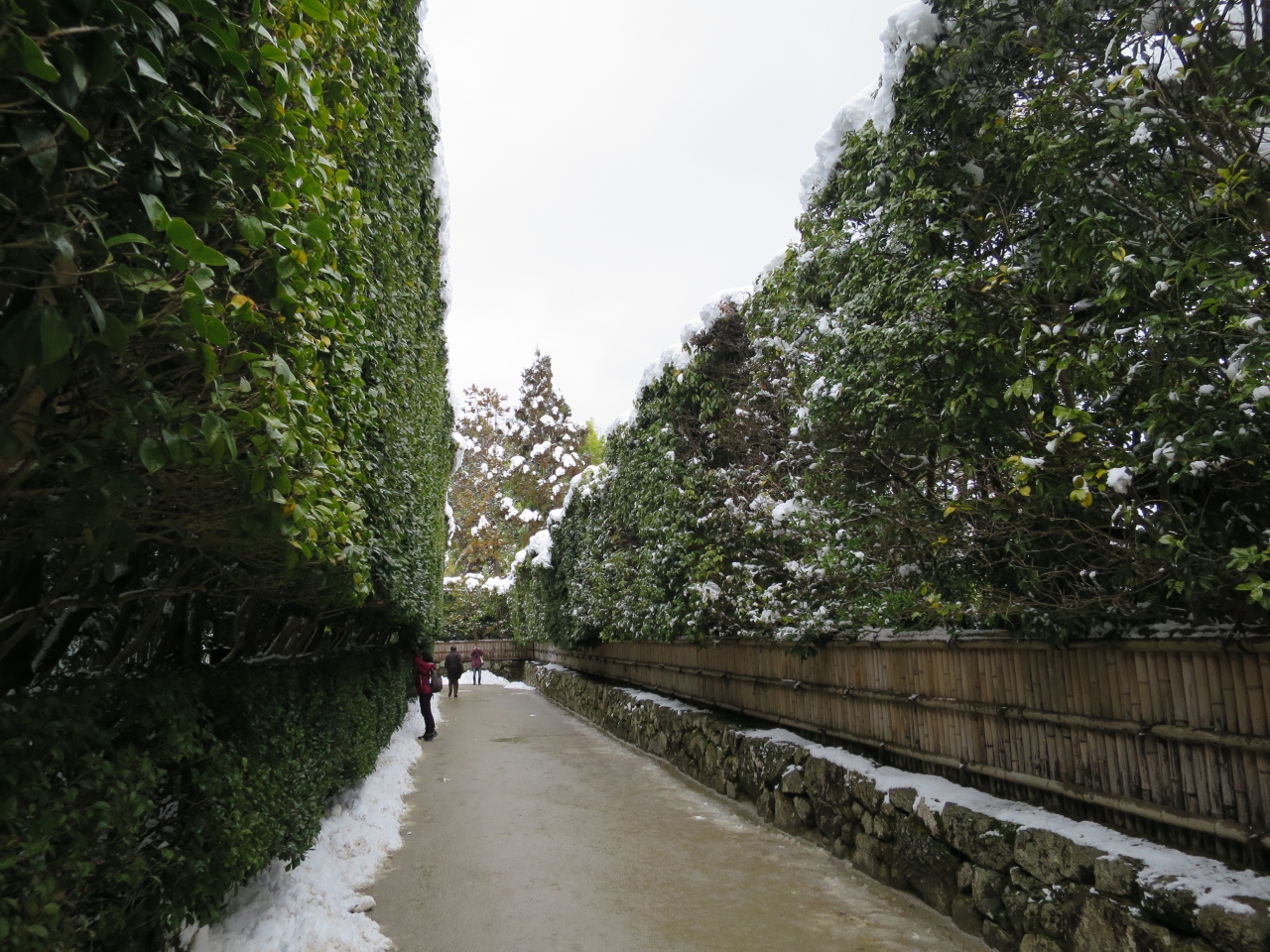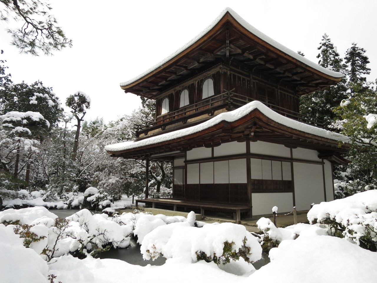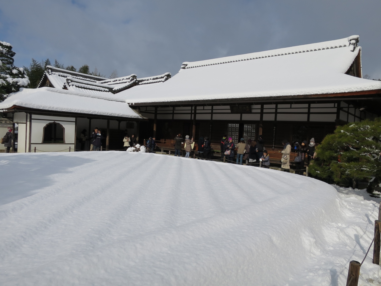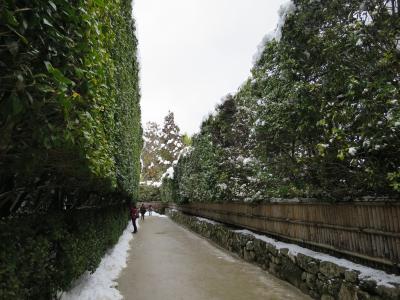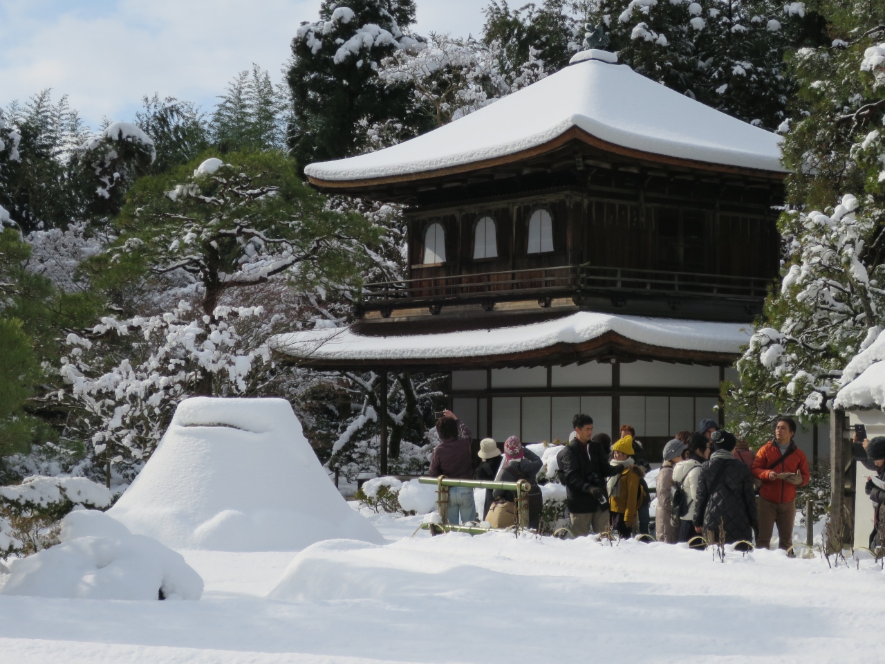 庭園の銀沙灘、向月台も雪に覆われしまっていましたが、こちらは、どちらも元々白砂なので、見た目は余り変わりません。雪のせいで奥の高台は立ち入り禁止になってしまい、高台からは雪の銀閣が見られなかったのだけが残念でした。- 旅行時期