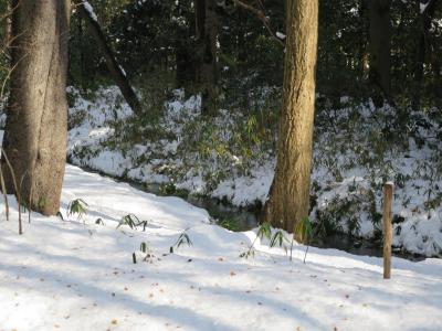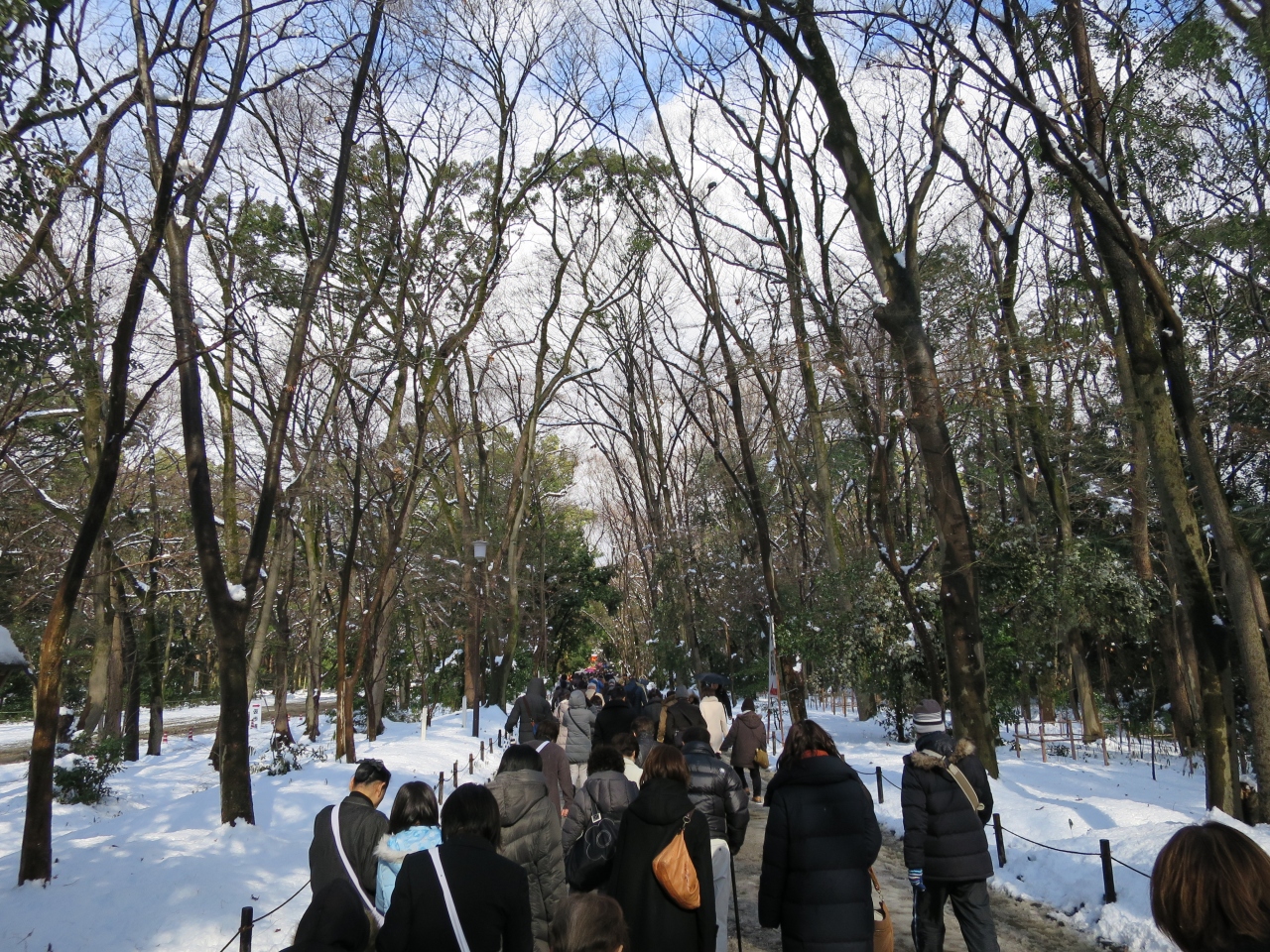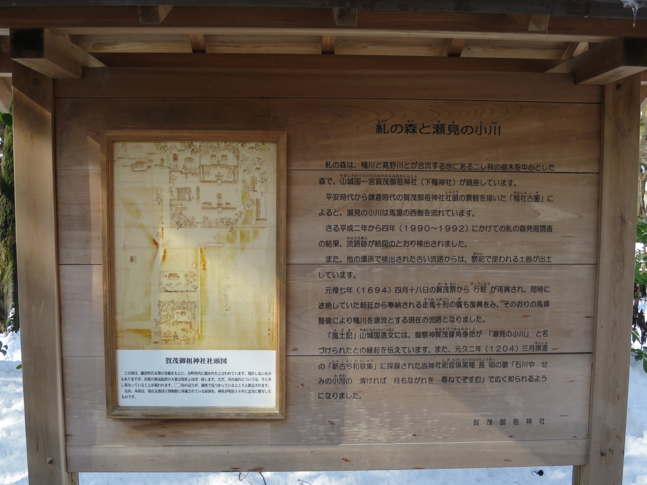 糺の森は下賀茂神社本殿の南側に広がる鬱蒼とした森です。1/3に下賀茂神社に初詣に行った際に糺の森をまっすぐ一直線に突き抜ける参道を歩きました。足元は積雪でべちょべちょ、更に木々に積もった雪が解け出し、頭上からどさっと落ちてくるので、注意が必要です。
