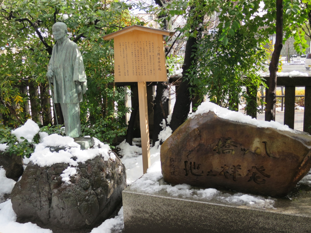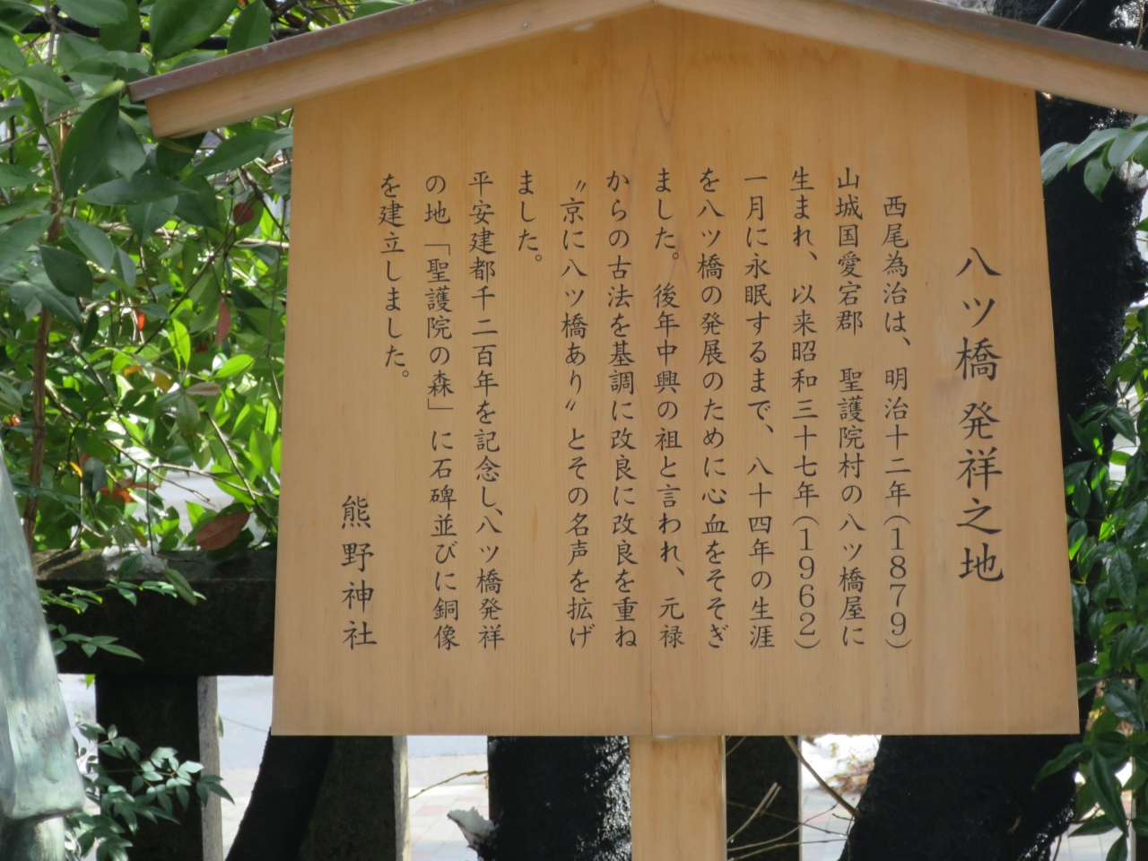 この付近は京都土産で有名な聖護院八ッ橋のお店がある所で、境内の中には八ッ橋発祥の地とされ、西尾八ッ橋の西尾為治の銅像が建立されています。