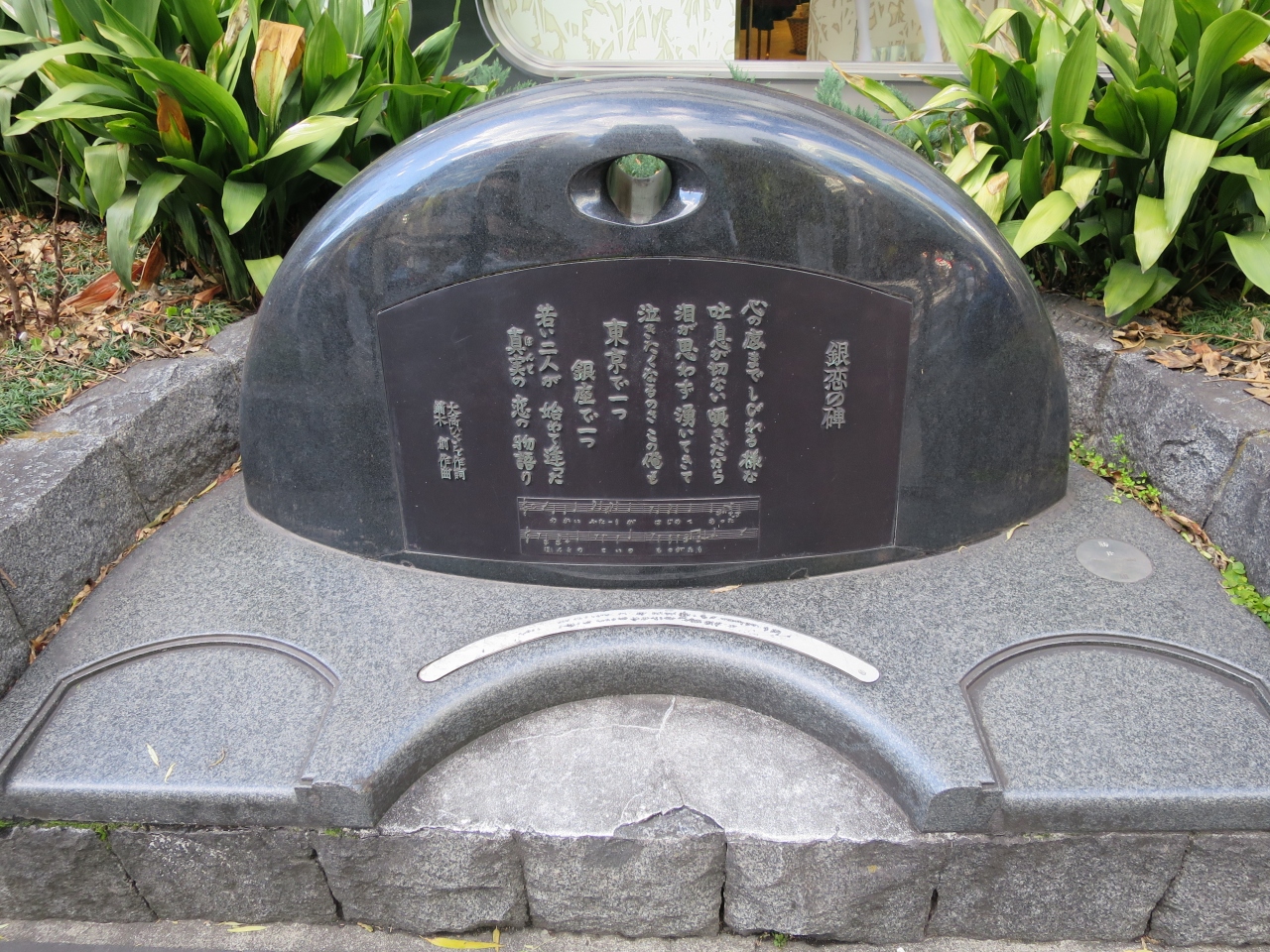 数寄屋橋交差点から東京駅方面に歩いたところにある数寄屋橋公園に昭和36年にヒットした石原裕次郎と牧村旬子のデュエット曲の定番、「銀座の恋の物語」を記念して建てられた、銀恋の碑があります。