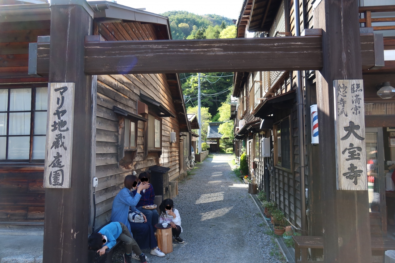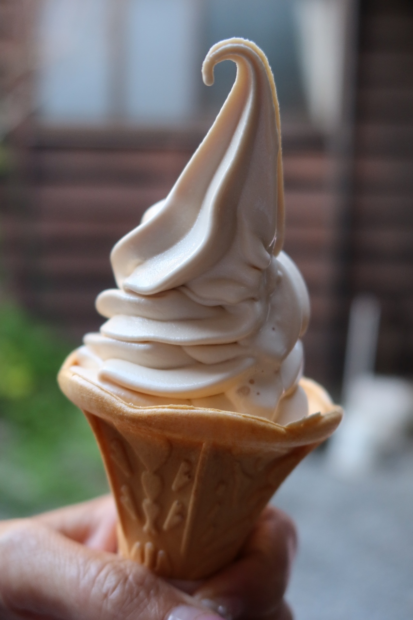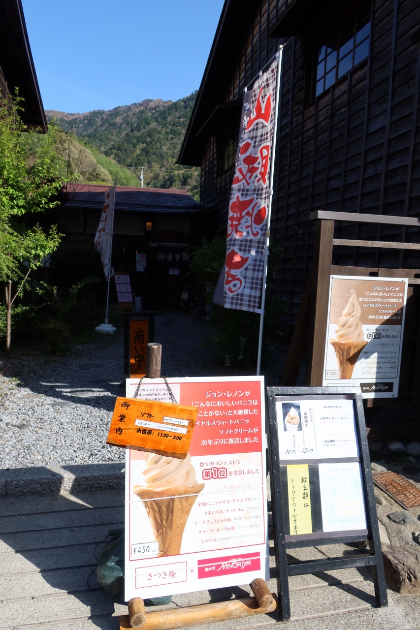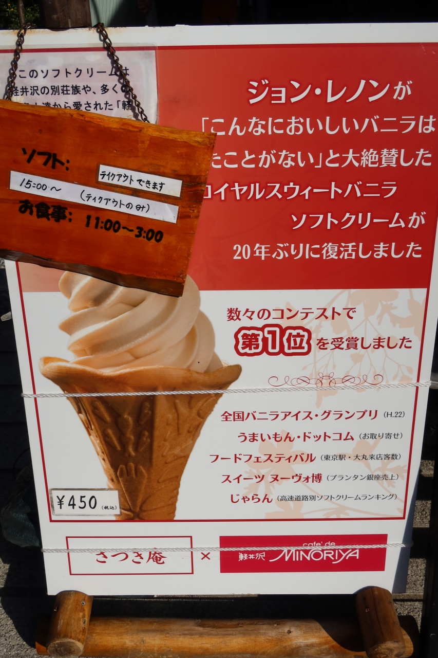 旧中山道の奈良井宿の鍵の手の近くにさつき庵があります。少し暑かったので、一服するのに利用しました。頂いたのはロイヤルスウィートバニラと言うソフトクリーム。ジョンレノンが絶賛した軽井沢のカフェ・ド・ミノリヤの味を復活させたソフトです。少し茶色ががったソフトは黒糖とキャラメルの様な味わいのある味。