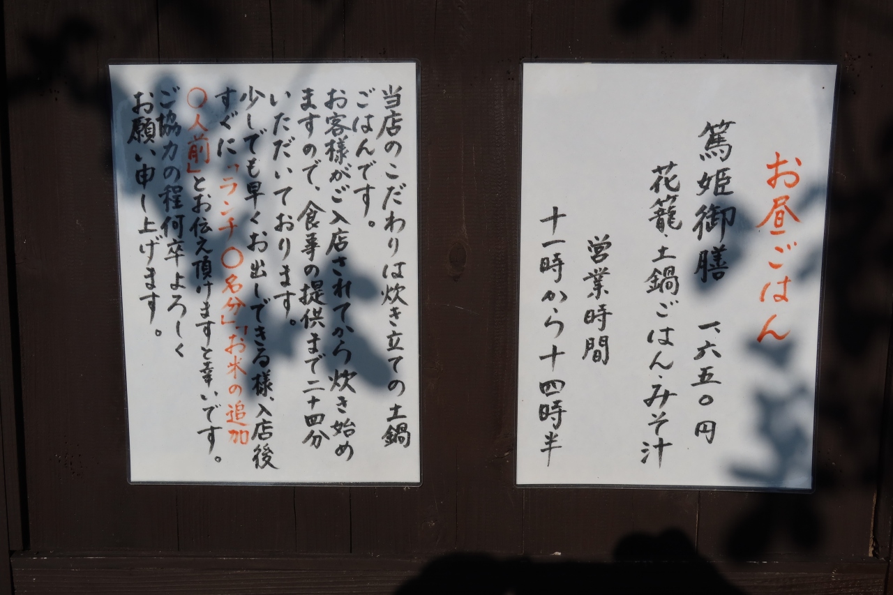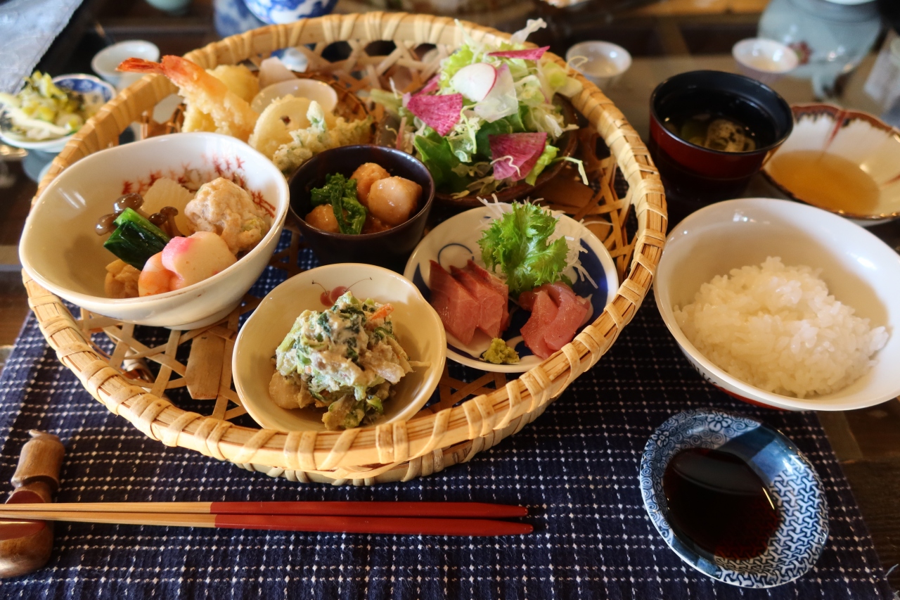 ランチメニューは篤姫御膳と言う花籠に入ったおかずと土鍋で炊いたご飯のみ。花籠には天ぷら、お造り、煮物などが盛り付けられどれもこれも美味。