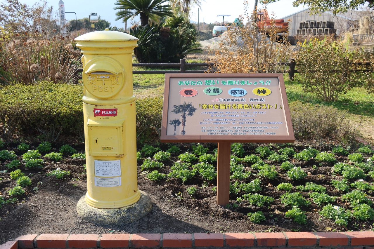 JR九州の最南端に位置する駅である指宿の西大山駅を降りた所に黄色く塗られた旧型の円筒ポストがあります。それが幸せを届ける黄色いポストです。同じ様にオリーブ色に塗られたポストを小豆島でみたことがありますが、こちらもホントに手紙を投函することができます。最南端の駅から行ったことの証明にもなり、旅の思い出に絵葉書でも投函すると良いと思います。
