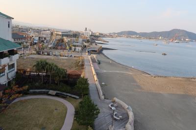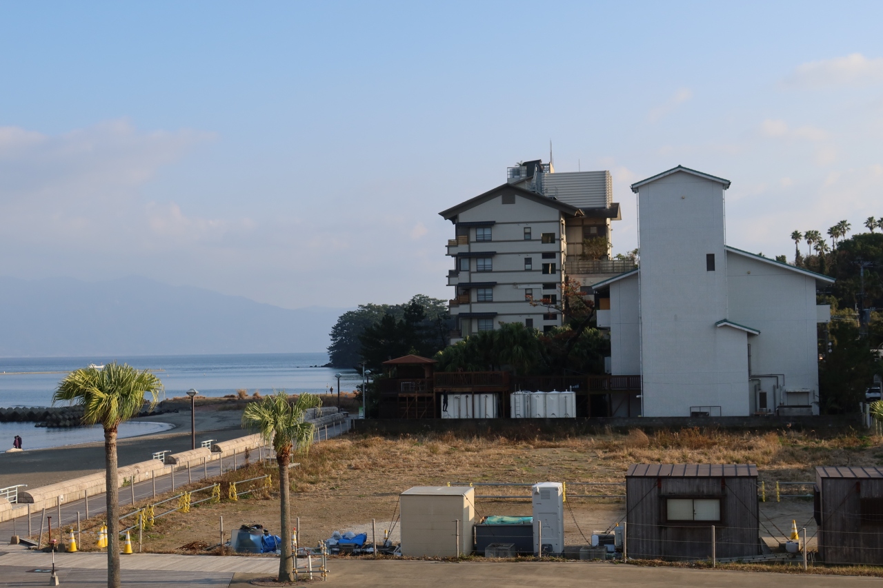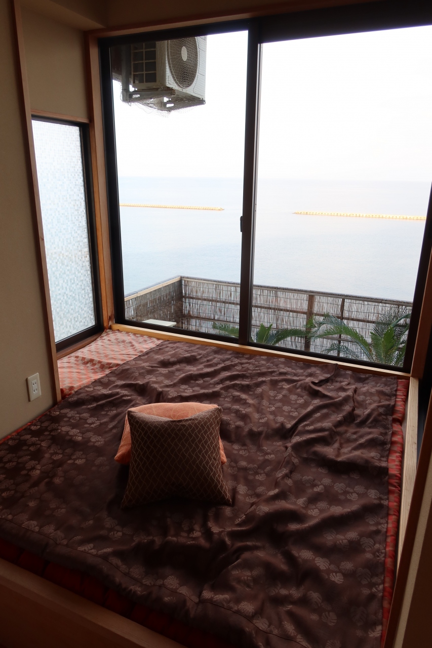 砂むし会館「砂楽」の南側100m程の所に夫婦露天風呂の宿 吟松があります。宿泊したのは岩風呂の露天風呂がついたまどろみツインの部屋。掘りごたつと、まどろみリビングがついており、目の前に広がる錦江湾の海の眺めが良い部屋です。食事は温泉が湧き出る個室部屋で頂きことができ、料理の量も適量。薩摩料理を堪能することができました。