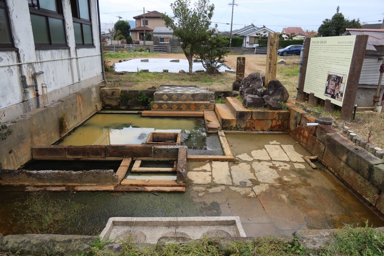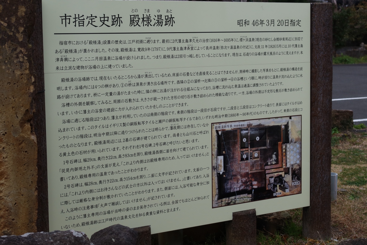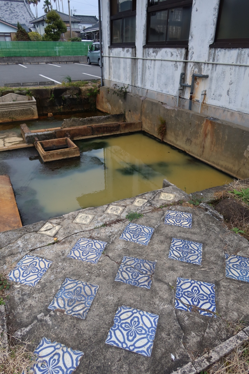 指宿を通る国道226号線の二月田交差点から、川沿いに西に200m程行った所に殿様湯跡(二月田温泉)があります。10代藩主である島津斉興の湯治場があった場所で、今でも建物の裏に当時の湯舟の跡が残っています。綺麗なタイルが嵌め込まれ、ハイカラだったんだなと思いました。