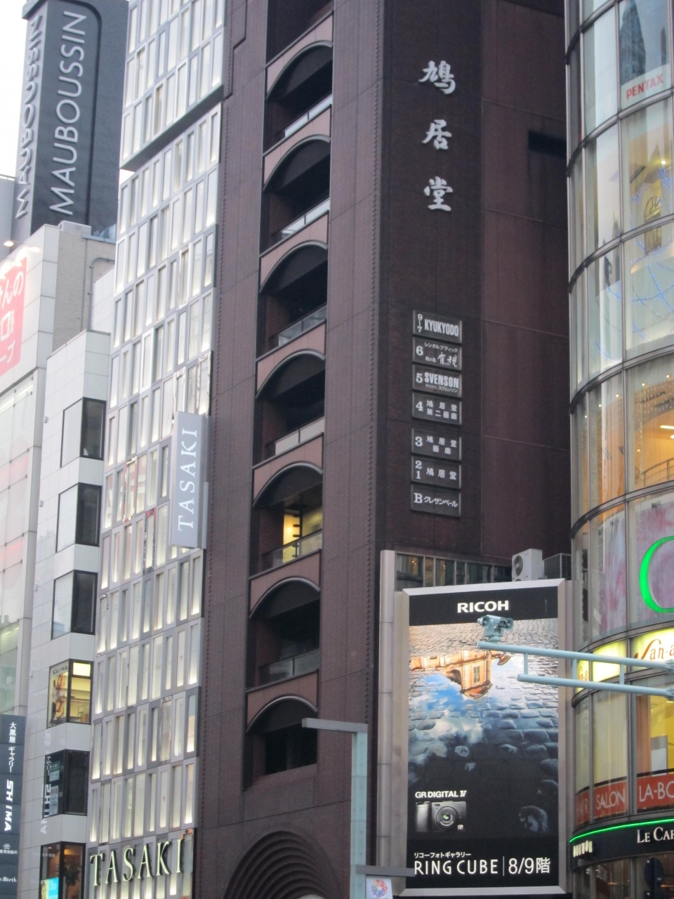 東京鳩居堂 銀座本店は便箋、和紙、筆、墨などの和文具、香を扱う老舗で、京都寺町にも本店があります。この店で有名なのは、鳩居堂前が日本の土地路線価28年連続No.1と言うところです。はがき1枚で約32万円だそうです。和光の前の方が高そうなんですけどね。