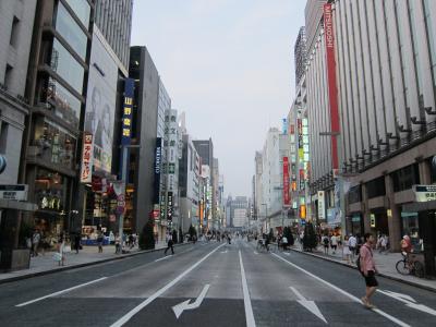 新橋から京橋に続く銀座の中心地を南北に抜ける目抜き通りで、通り沿いには博品館、資生堂パーラー、松屋、三越、ミキモト、鳩居堂、和光、木村屋等々老舗店が揃います。土日祝日には正午から夕方までは歩行者天国になり、パラソルや椅子が設置されます。