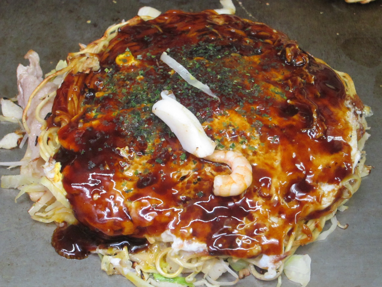 広島風お好み焼きは食べたことがありましたが、本場では食べたことがなかったので、宿泊したホテルから一番近い正統派広島風お好み焼店の貴家に行きました。週末の夜だったからか、19:30で満席、外には7組ほどが並んでいました(椅子在り)。店内はカウンタ席で、目の前の鉄板で調理してくれます。広島風お好み焼きはそばだと思い込んでいたのですが、うどんもありました。庶民的な雰囲気のお店です。