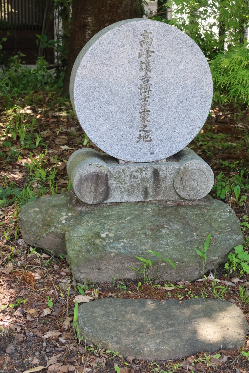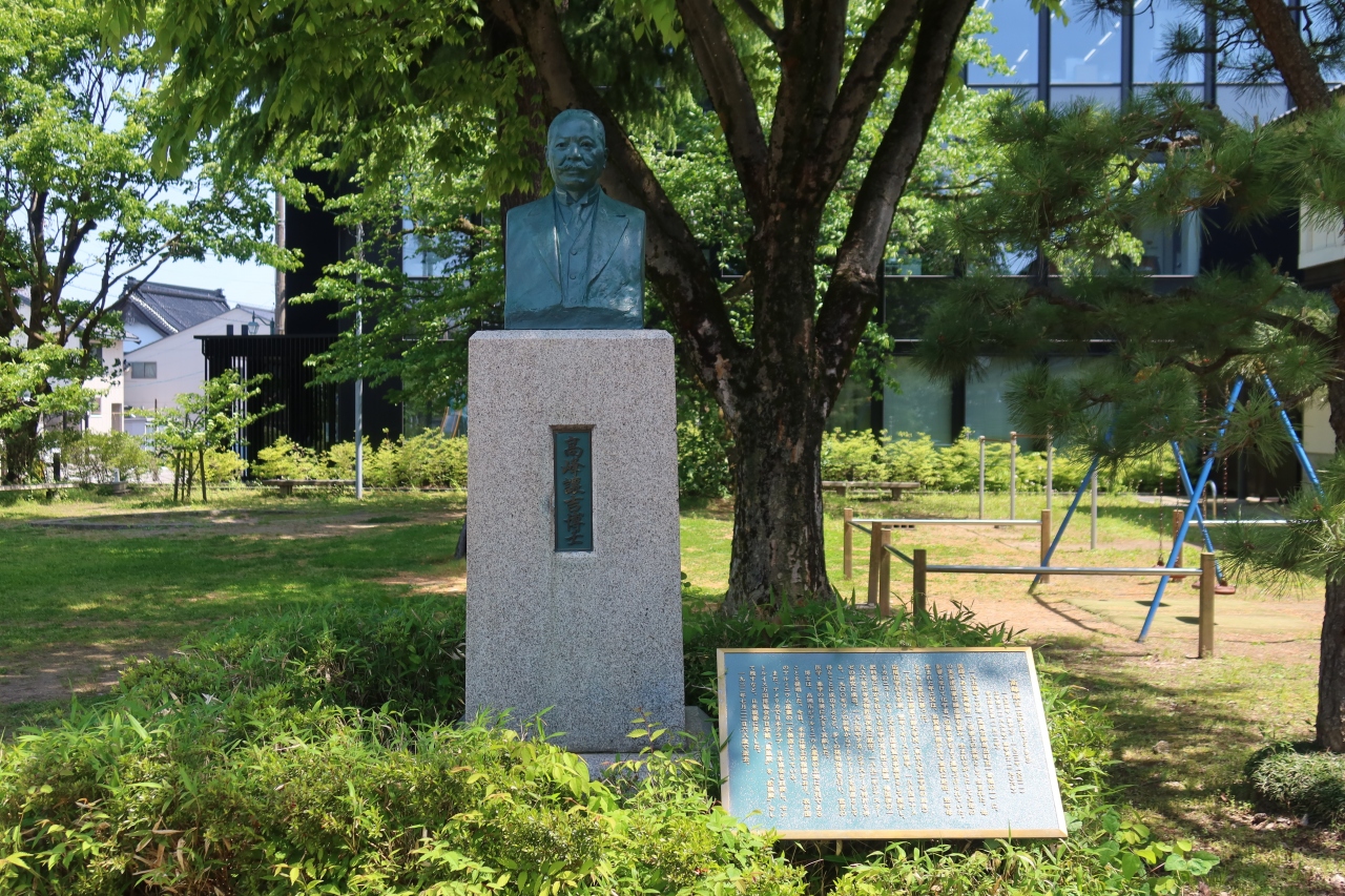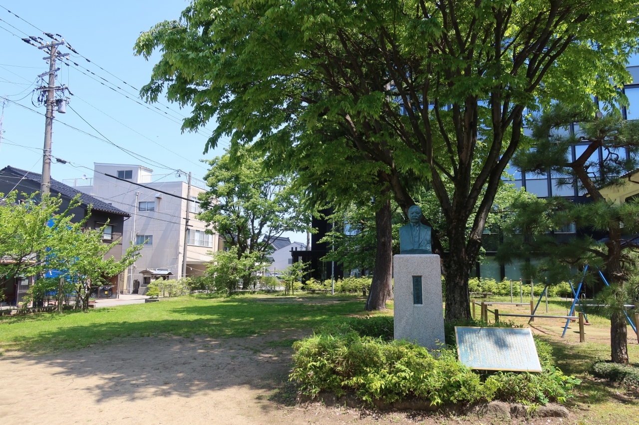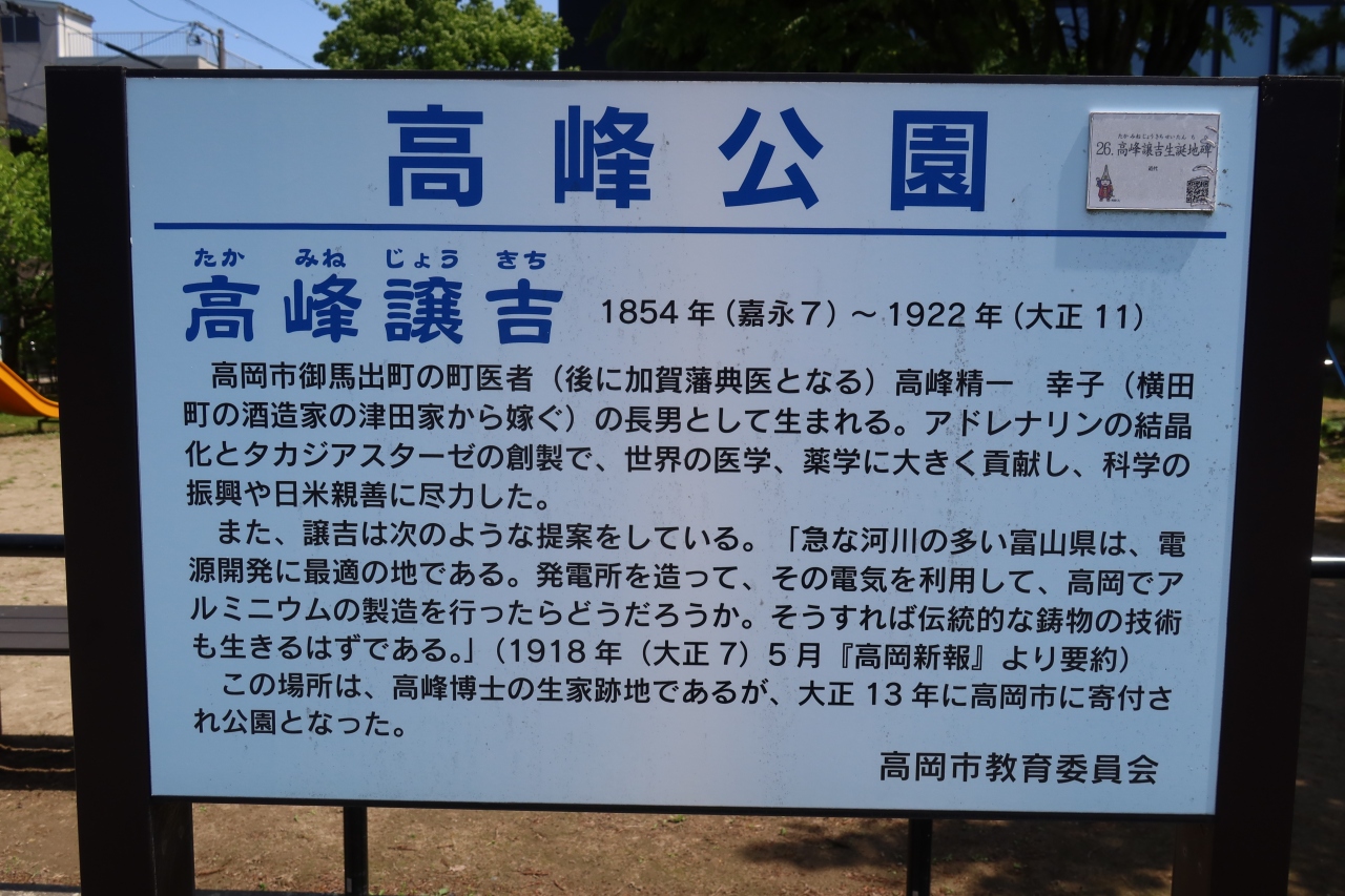 高岡の山町筋にある高岡郵便局の交差点を北西に行った先に高峰公園があります。アドレナリンを発見し、タカヂアスターゼを開発、化学肥料も製造した薬学化学の偉人である高峰譲吉が産まれた生家跡が高峰公園として整備されています。その公園の木の下に高峰譲吉の功績碑があります。