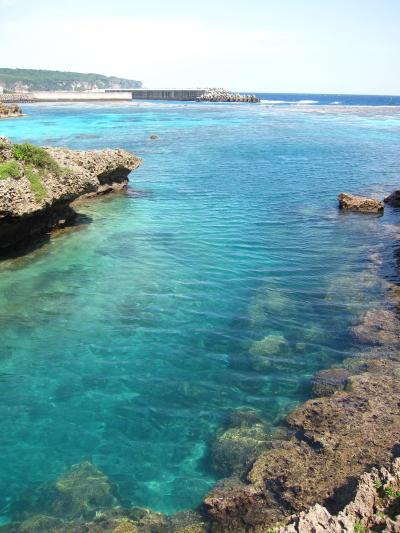 駐車場から遊歩道が整備されており箱庭のような入り江を囲む公園です。さらに階段を上って展望台に登ると眼下にさんご礁、外海を一望することが出来ます。何故か展望台には牛の人形が置かれています。行ったときは干潮で、地元の人が潮干狩りに来られていました。