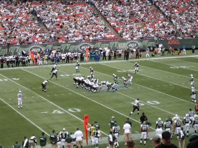 2005年にMLBとNFLが同時に見られる9月のニューヨークに行き両方観戦してきました。当時のNYジェッツはジャアンツとジャイアンツ・スタジアムを共用していましたが、今は閉場となっています。スタジアムへはマンハッタンからバスで30分ほどです。スタジアムの周りはだっだぴろい駐車場で帰りのバス停が判るか不安になったほどです。1階の席で試合を観戦。延長戦になり良い試合を見られました。