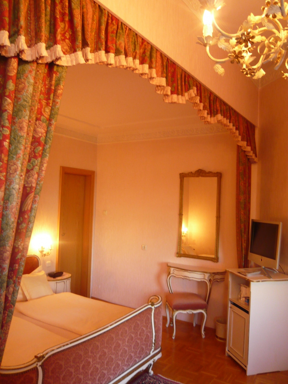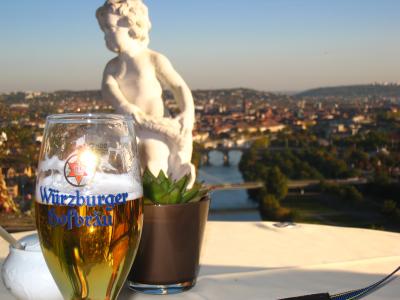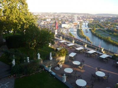 ドイツ旅行で一度は古城ホテルに泊まりたいと思い個人でこのホテルを手配しました。古城ホテルとは言うものの外見は邸宅と言った感じです。レンタカーだったのでホテルは遠くから見えているものの、狭い道を通るので大変でした。駐車場はホテル裏手にあります。ホテルに着いたのは夕方前で、ホテルのテラスからビールを片手に目の前にひろがるブドウ畑越しにみえるヴュルツブルク市街の夕景はすばらしかったです。また夜の夜景も雰囲気があります。部屋は二階の突き当たりの部屋でスーツケースを運ぶのは大変でした。夕食は周りにレストランはないのでホテルのレストランになります。
