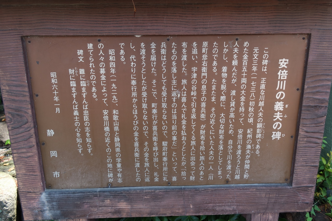 安倍川餅を食べたかごやの近くに建てられていた石碑が安倍川義夫の碑です。石碑には何と書かれているのか良く分からないので案内板を読むと、橋の架かっていなかった安倍川を渡す川越人夫の正直さを称える内容が書かれていました。読めなかった碑文には「難に臨まずんば忠臣の志を知らず。財に臨まずんば義士の心を知らず。」と書かれているとのこと。今の日本人に通じる所がありますね。海外ではまずない。