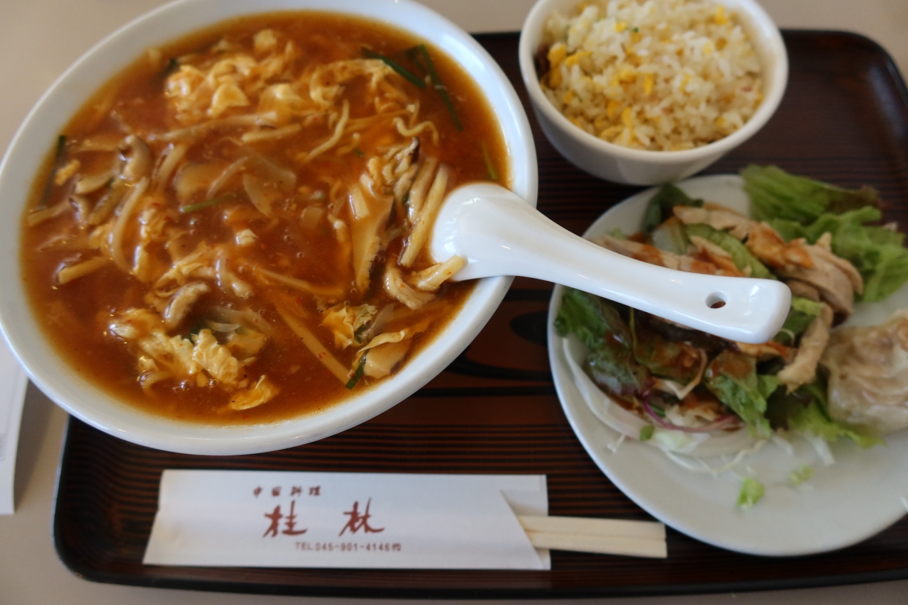 あざみ野駅西側の駅前交差点の角のビル2階に中華料理店 桂林があります。土曜日昼のランチに利用。12時前に行くとすんなりと入れました。色々とメニューがあり、今回は担々麺セットを注文。メインの担々麺とチャーハン、小皿のついたセットです。出て来た担々麺は胡麻の味は一切なく、赤色をしたサンラータンでした。味はそこそこなのですが、それは担々麺じゃないよなと思いつつ頂きました。