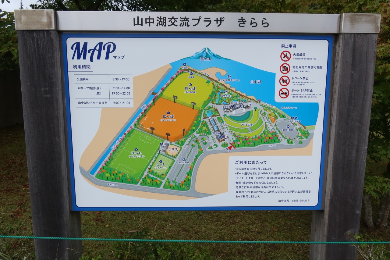山中湖の東岸南湖畔に山中湖交流プラザ きららはあります。広大な敷地内には広場、サッカー場、テニスコート、屋外ホールがあるほか、湖岸にはウォーキングロードもあります。イベント等で訪れる以外は観光的に目的もなく、わざわざ行く所ではありません。