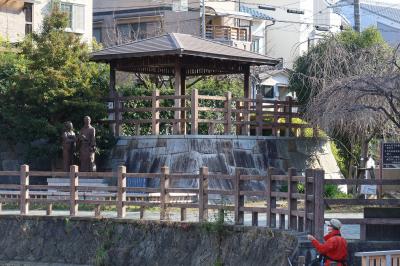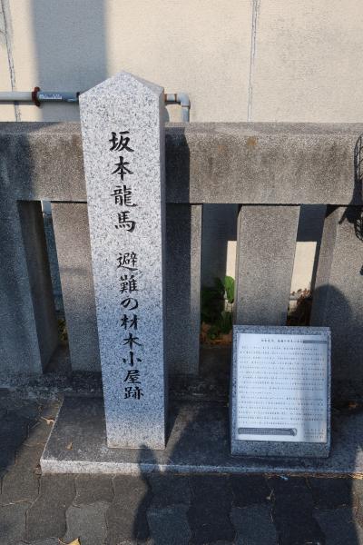 寺田屋で奉行衆によって襲撃され、手負いを負った坂本龍馬が隠れた材木小屋の場所が濠川に架かる大手橋の西詰北側。そこに石碑と銘板が設置されています。