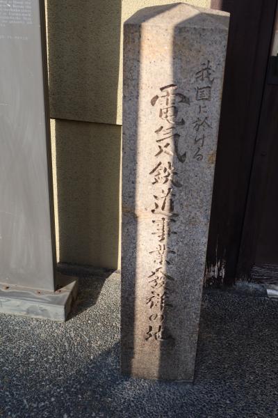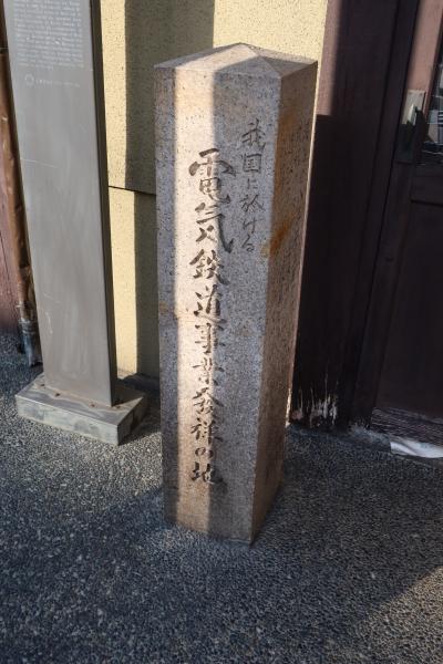 伏見を通る竹田街道と油掛通りの交差点角、伏見駿河屋の前に電気鉄道事業発祥の地の石碑が建てられています。夏に七条にある電気鉄道事業発祥の地を見て、反対側の起点である伏見にもあることを聞いていたのですが、確かに同じ石碑建てられていました。七条の石碑よりシンプルですね。