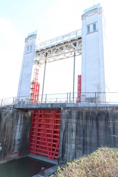 伏見を流れる濠川が宇治川に流れ込む場所に2つの大きな門があります。これが三栖閘門です。改修によって淀川との行き来が不可能になってしまい、昭和4年に伏見港と宇治川との船の通航を可能とするために作られた閘門。