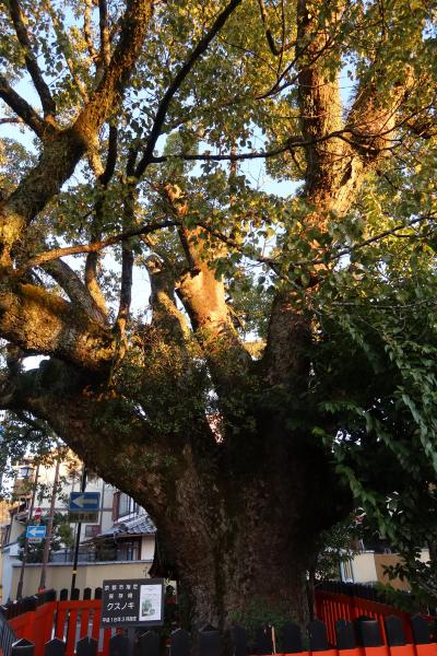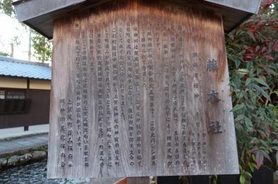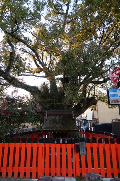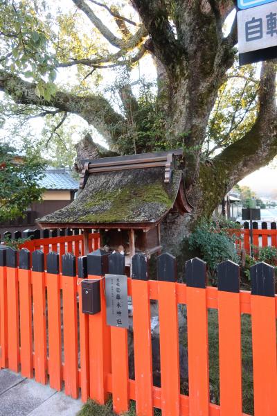 上賀茂伝統的建造物群保存地区の東側、明神川の傍に建つ大きなクスノキの袂にある小さな祠があります。それが藤木社です。クスノキは推定樹齢500年と言われ、社家のシンボル的な存在になっています。藤木社は瀬織津姫神を祀る上賀茂神社の境外末社で明神川の守護神と言われています。