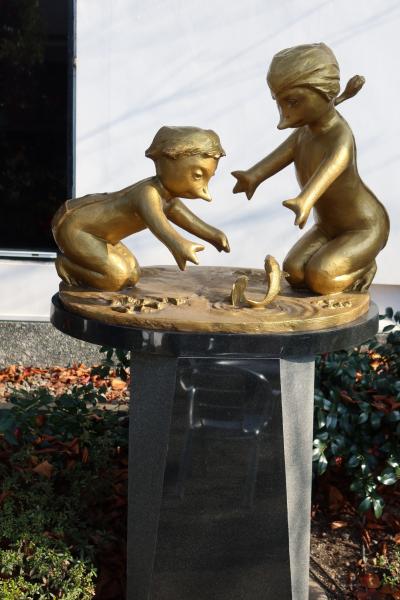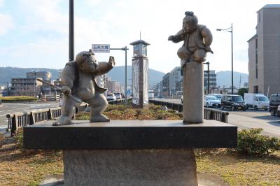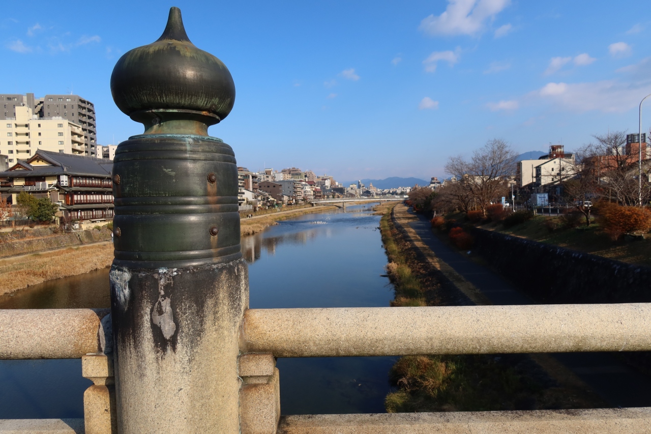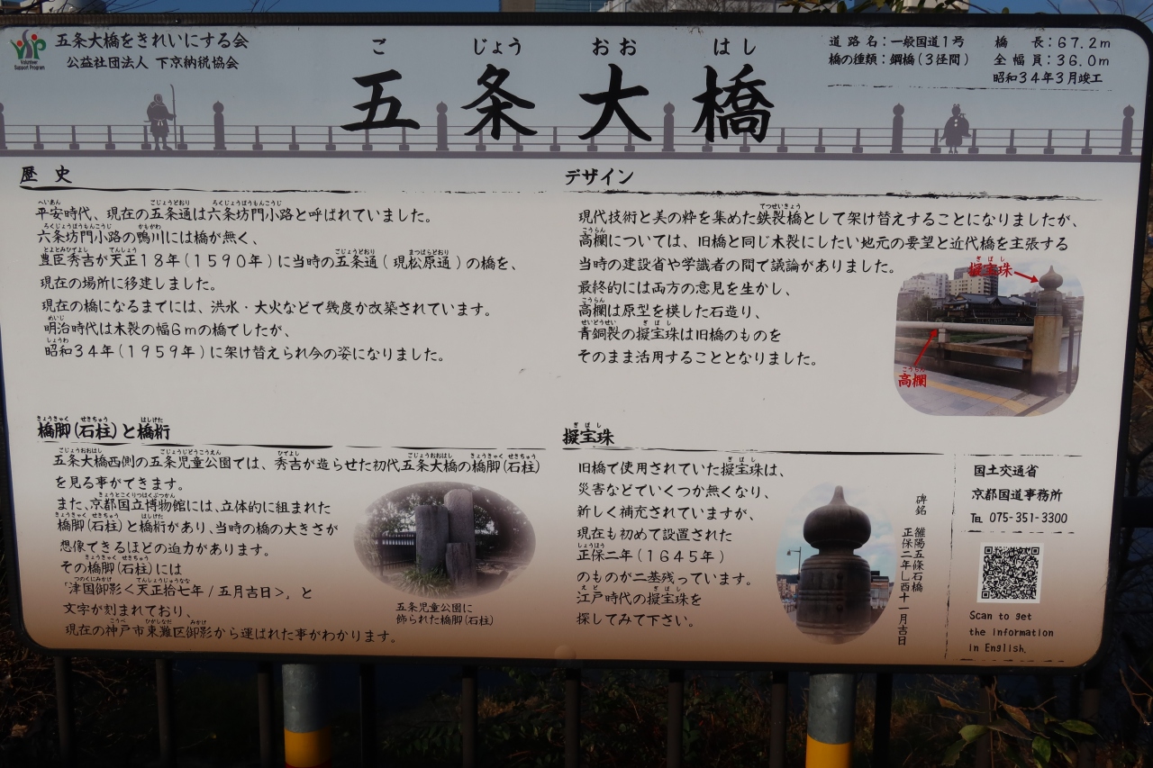 五条大橋の西側にある五條通りの中央分離帯に牛若丸弁慶像が設置されています。五条大橋と言えば牛若丸と弁慶が初めて出会った場で、弁慶の長刀をひらりとかわしたと言う、場面が再現された石像なのですが、その姿が可愛らしい。