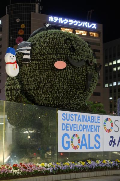 JR浜松駅の北口広場の奥に丸い球体の形をした緑のモニュメントが設置されています。それがモザイカルチャー 出世大名家康くんです。モザイカルチャーは草木を組みあわせて作られたモニュメントで、出世大名家康くんは天下を取った徳川家康を模した浜松のキャラクターマスコットです。