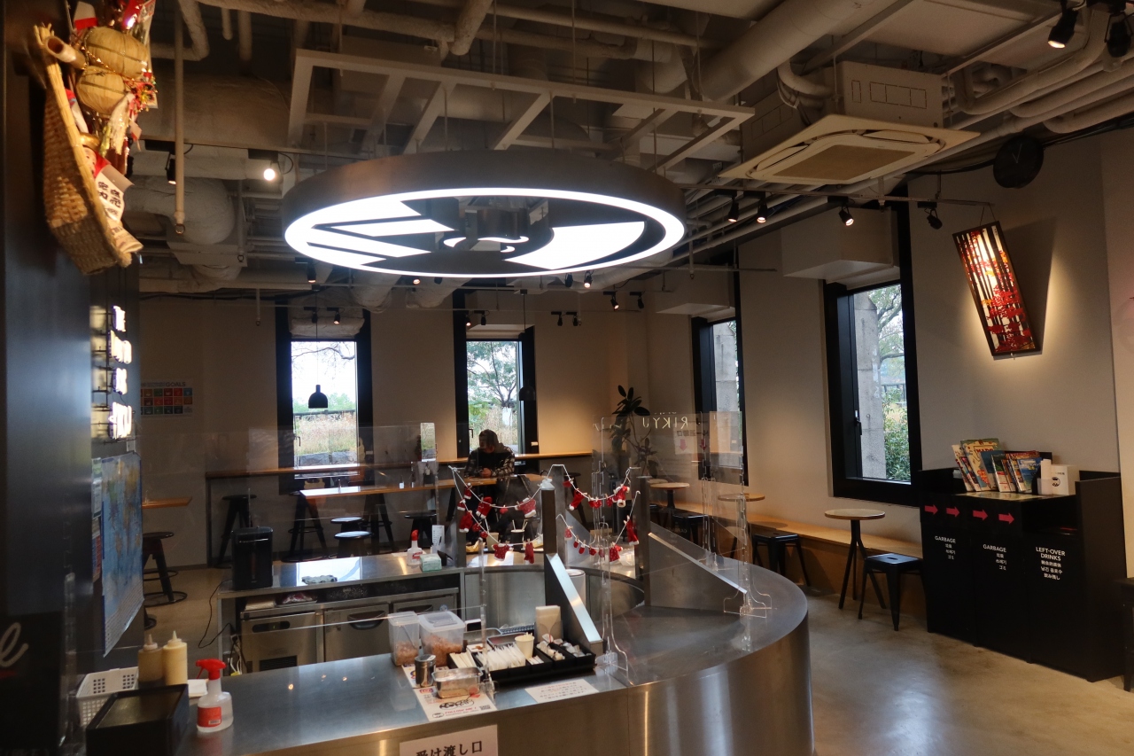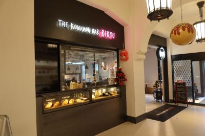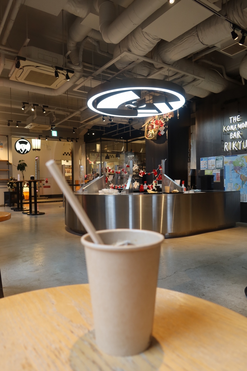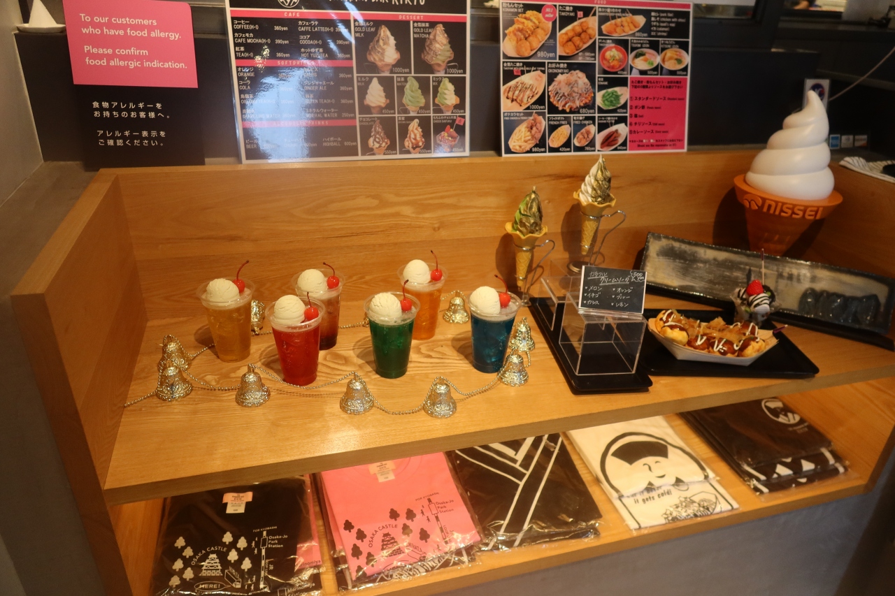 大阪城公園本丸にあるミライザ大阪城の1階、右手最奥にザ・コナモン・バル 利休があります。コナモンは粉物の意味で、たこ焼きを中心に、ソフトクリーム等を扱う喫茶店の様なお店。ポップな雰囲気の店内はどちらかと言うと外人の人が喜びそうな感じのお店です。