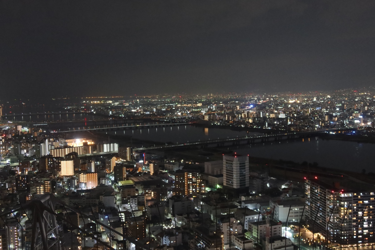 新梅田シティのシンボルタワーが梅田スカイビル。その最上階、屋上にあるのが空中庭園展望台です。ツインタワーに丸穴のあいた板を乗せた様なスカイビルも建築学的に見物でありますが、空中庭園からの眺めも見事。夜景を見たのですが、梅田やキタのビル街の夜景、淀川の夜景が目の前に見渡せます。あべのハルカスは未だ行ったことありませんが、ここの夜景も見事です。