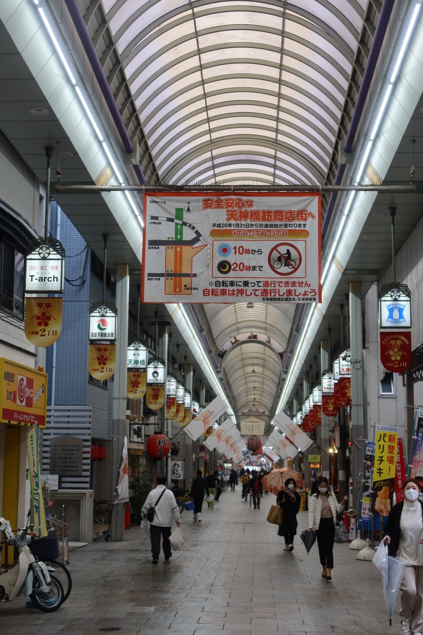 天神橋筋1丁目から6丁目に至る日本一長いとされる商店街です。アーケードが架けられた商店街は2,6㎞程もあり、兎に角長く、こんなに長い商店街は見たことがありませんでした。そして、大阪らしい店が沢山あり、歩いているだけでも楽しい商店街。