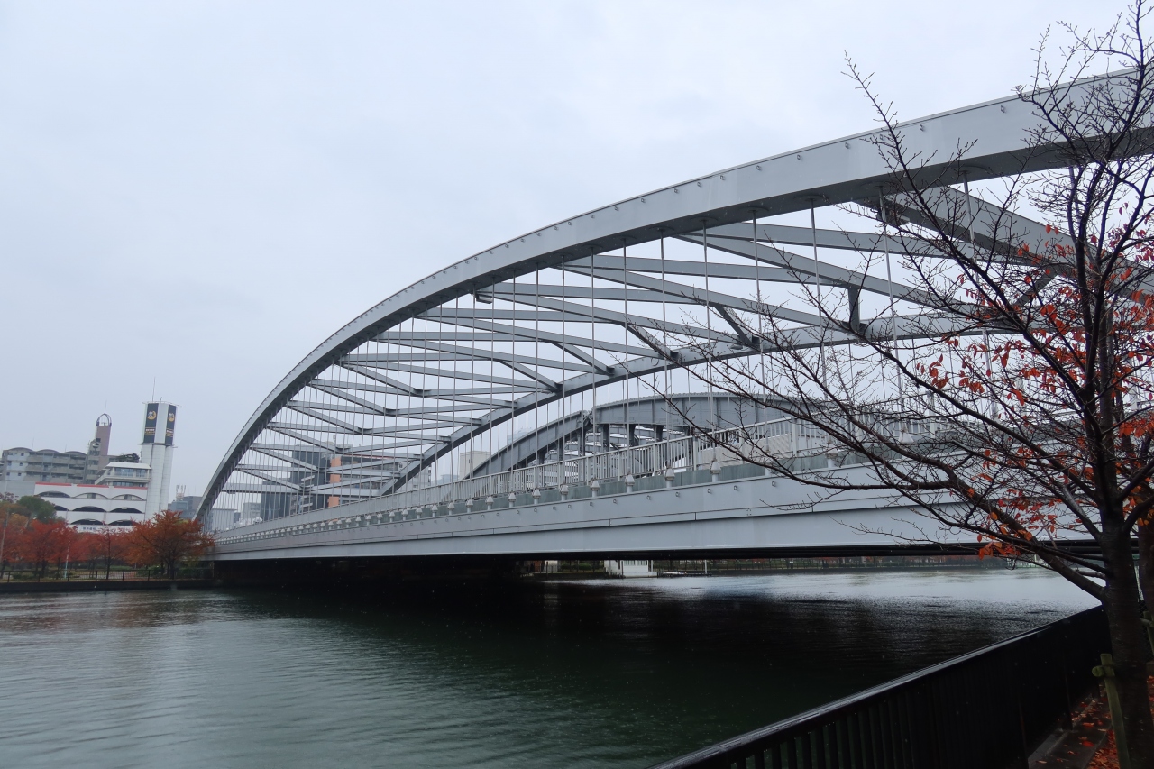 大阪市内を流れる大川に架けられた180m程ある橋で、国道1号線が上を通っています。戦前より銀橋と呼ばれるほど、市民に親しみを持たれています。車で通ると道幅があり、橋の感じが分かりませんが、桜之宮公園から、橋の横型をみると、アーチ型の美しいフォルムが印象的な橋です。
