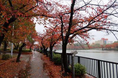 大阪市内を流れる大川に架かる桜宮橋付近の河川敷を利用した公園が毛馬桜之宮公園です。大川に沿ったプロムナードの桜並木は桜の時期は有名な場所ですが。秋の深まった時期もこの桜並木の紅葉がとても綺麗。行った日は生憎雨でしたが、しんみりした雰囲気がとても良かったです。