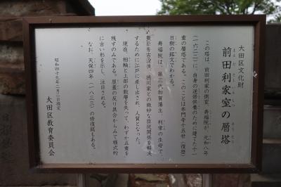 池上本門寺の境内、総合案内所の南側の墓所の一角に古い五層の供養塔があります。それが前田利家室層塔です。1622年に建立され、もとは十一層だったそうです。寿福院は利家の側室です。本門寺には力道山などの墓や、歴史的に古い人物の墓があり面白いです。