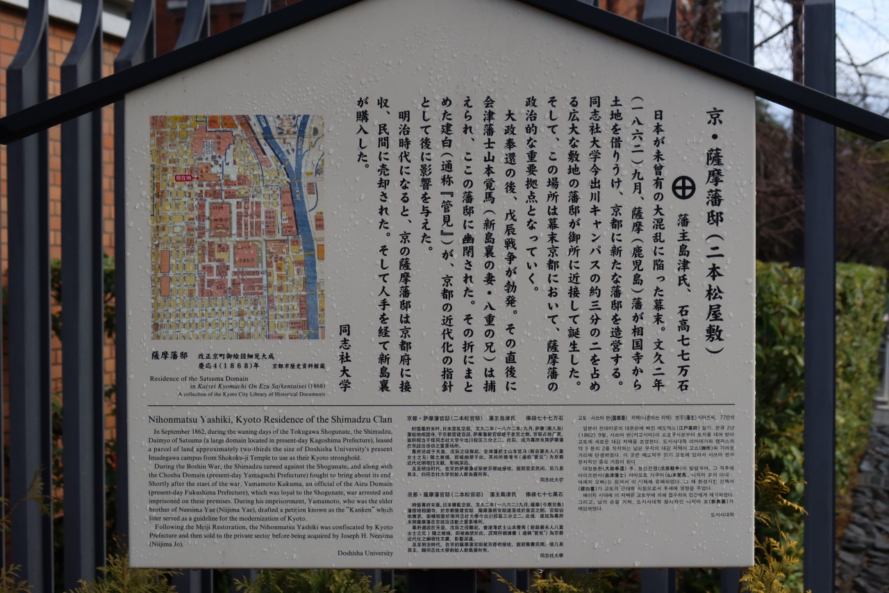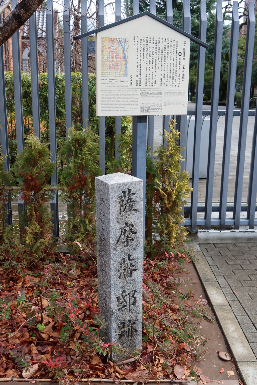 烏丸通りに面した同志社大学 今出川キャンパスの西門左手に植え込みの中に薩摩藩邸跡の石碑が立てられています。薩長同盟の会談場所となった二本松薩摩藩邸です。石碑しかありませんが、実際に行ってみると京都御所からすぐ目と鼻の先の場所だと言うことが分かります。歴史の動いた場所に実際に行ってみると当時はどんな状況だったのかが分かり、面白い。