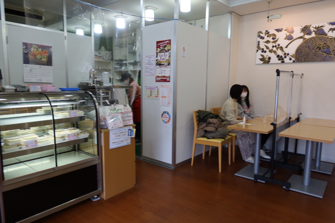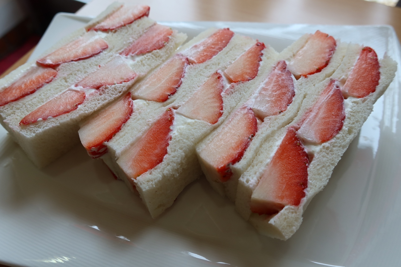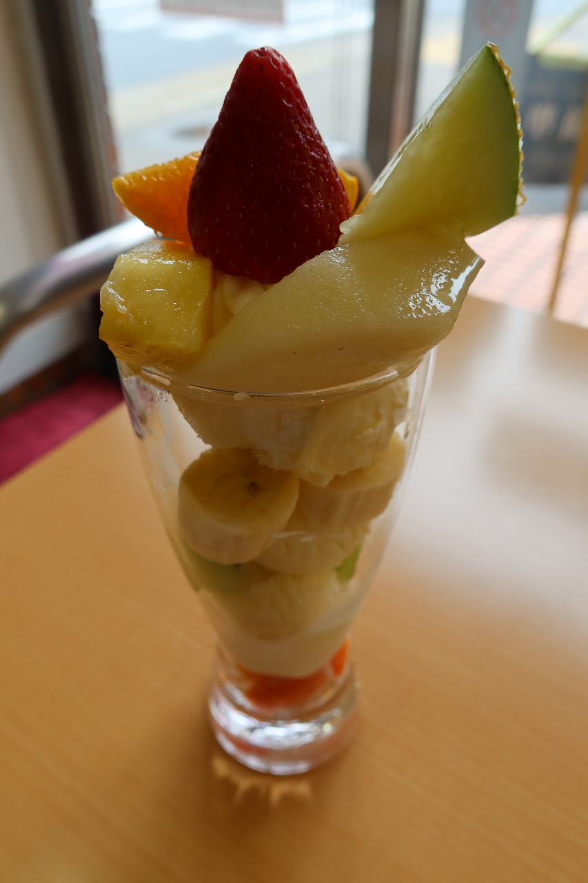 烏丸通沿い、同志社大学今出川キャンパスの北側にヤオイソの烏丸店があります。本店は四条大宮にあり、明治2年の創業で、何と150年の歴史を持つ果物店の老舗。この店はその支店で、果物販売店にフルーツパーラが併設されています。フルーツパーラは客席は5席程と広くはありません。頂いたのは季節のパフェと苺のフルーツサンド。新鮮な果物にあっさりとしたクリームが美味です。パフェは夏の方が良いですね。