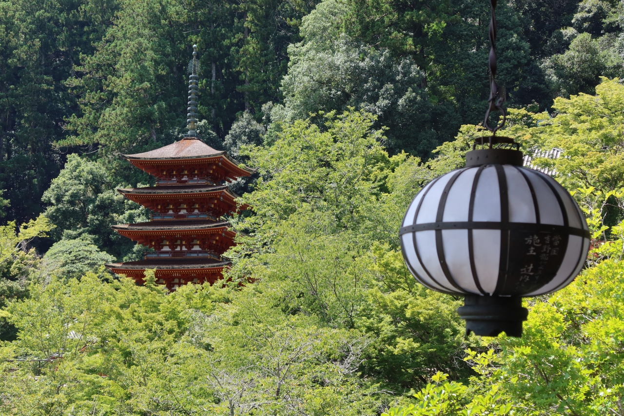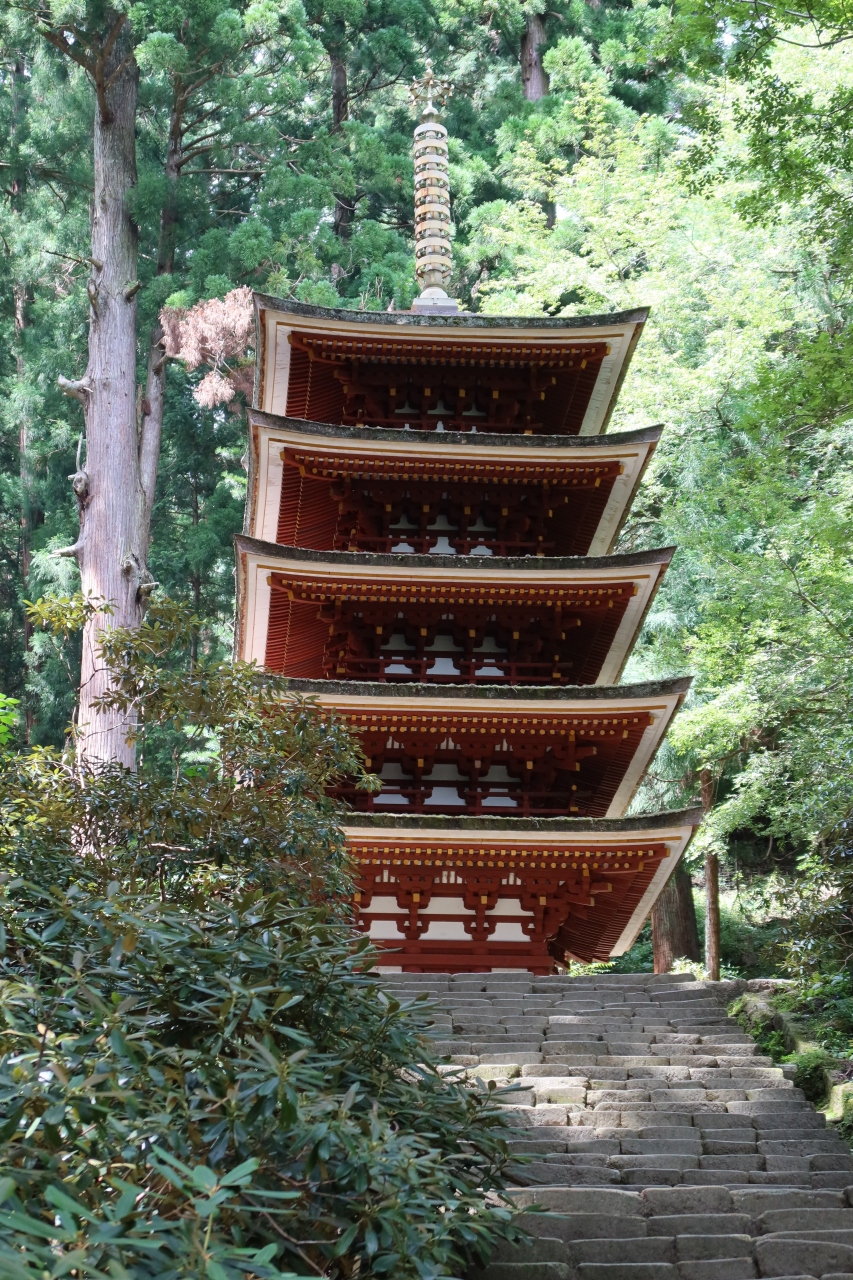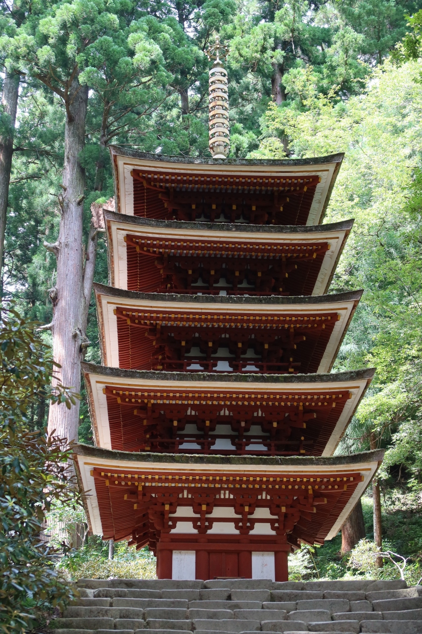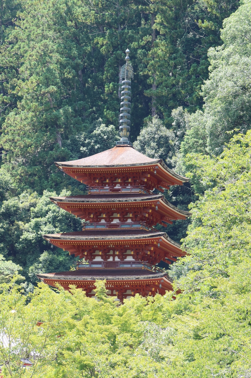 長谷寺の最奥、本堂から左手に進んだ所に五重塔があります。登廊及び本堂に見劣りするためか五重塔の近くまで行く人は余りいません(私も)。戦後の昭和29年に建てられた五重塔は本堂の舞台から見ると、一番景色になります。紅葉の時がベストでしょうが、青葉の中に建つ朱色の五重塔もなかなかのものです。