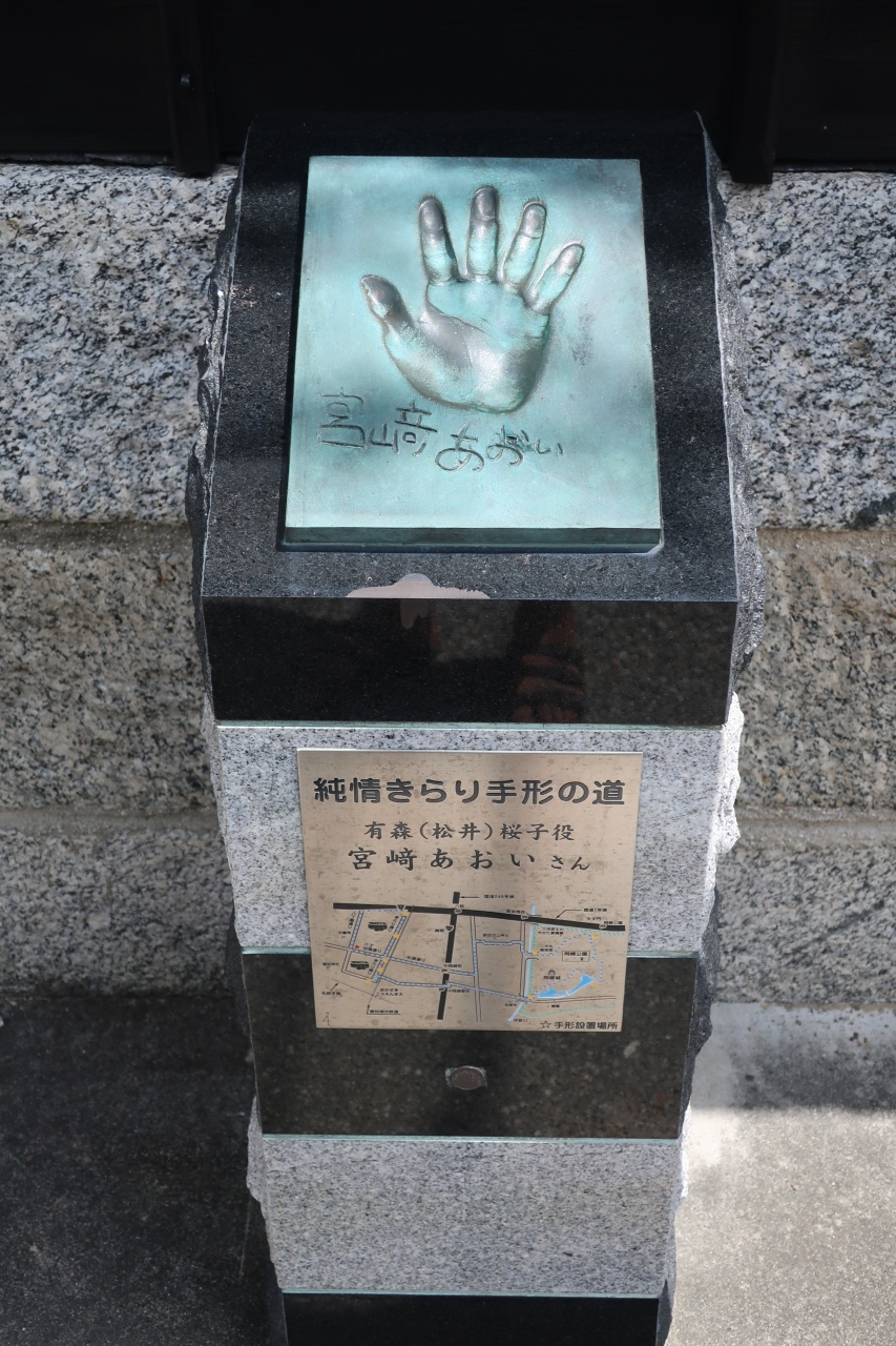 八丁味噌を題材にしたNHKの朝ドラ「純情きらり」は岡崎を舞台に作られました。そのロケ地にドラマ出演者の手形とサインが置かれています。私が見たのは八丁蔵通りに設置された有森桜子役を演じた宮あおいさんの手形。小さな手でした。